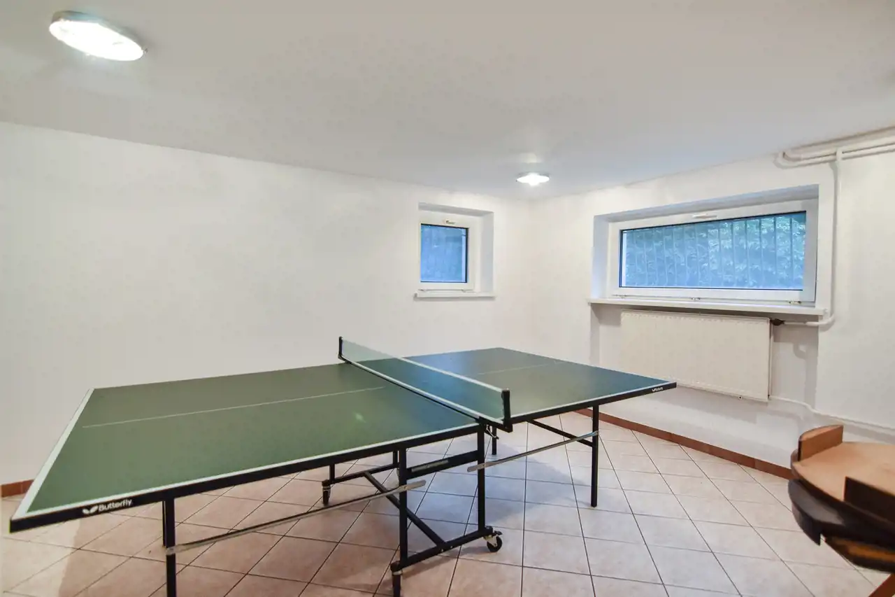 Dom ma płaski dach. Projektowany był jako parterowy ale faktycznie jest to wysoki parter o powierzchni 108 mkw oraz tej samej wielkości dobrze doświetlone wysokie przyziemie z oknami w każdym pomieszczeniu. Obecnie właściciel ma tam 2 gabinety, salę sportową, pralnię i kotłownię ale kondygnacja ta świetnie nadaje się też na firmę, tym bardziej, że oprócz wygodnych drewnianych schodów wewnętrznych, ma osobne wejście z boku domu.