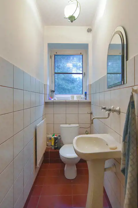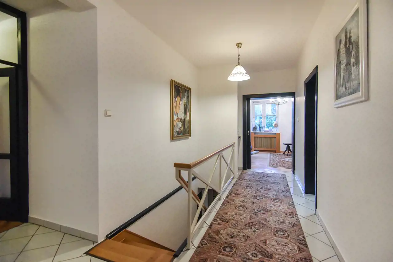 W tym drugim, takim bardziej prywatnym skrzydle, na wprost wejścia przechodzimy do części, gdzie znajduje się wc, łazienka oraz 3 sypialnie.