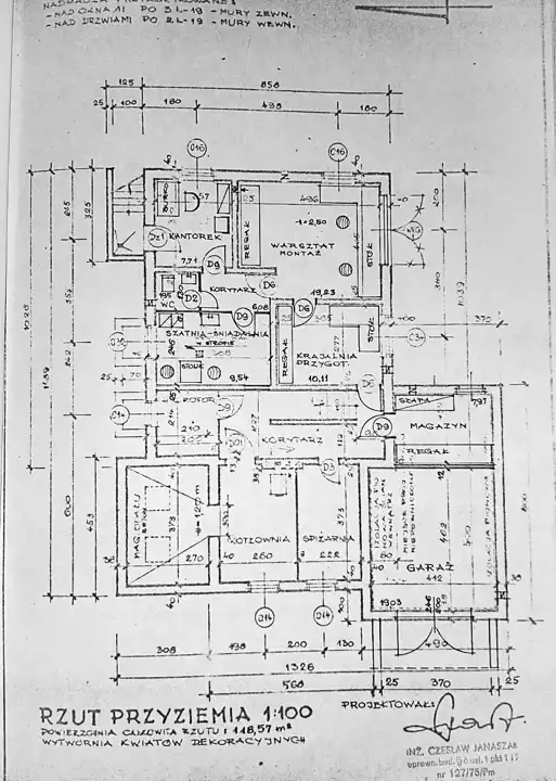 Budynek wymaga odświeżenia ale ciekawy rozkład stwarza duże możliwości aranżacyjne. Po wejściu do przedsionka wchodzimy do dużego przedpokoju, z którego na prawo droga prowadzi obok przestronnej garderoby i kuchni do dużego salonu. Z salonu jest wyjście na mały taras i do ogrodu. Tutaj zdecydowanie otwiera się przed nami koncepcja powiększenia tarasu i poprowadzenia go aż do końca drugiego, cofniętego skrzydła domu.