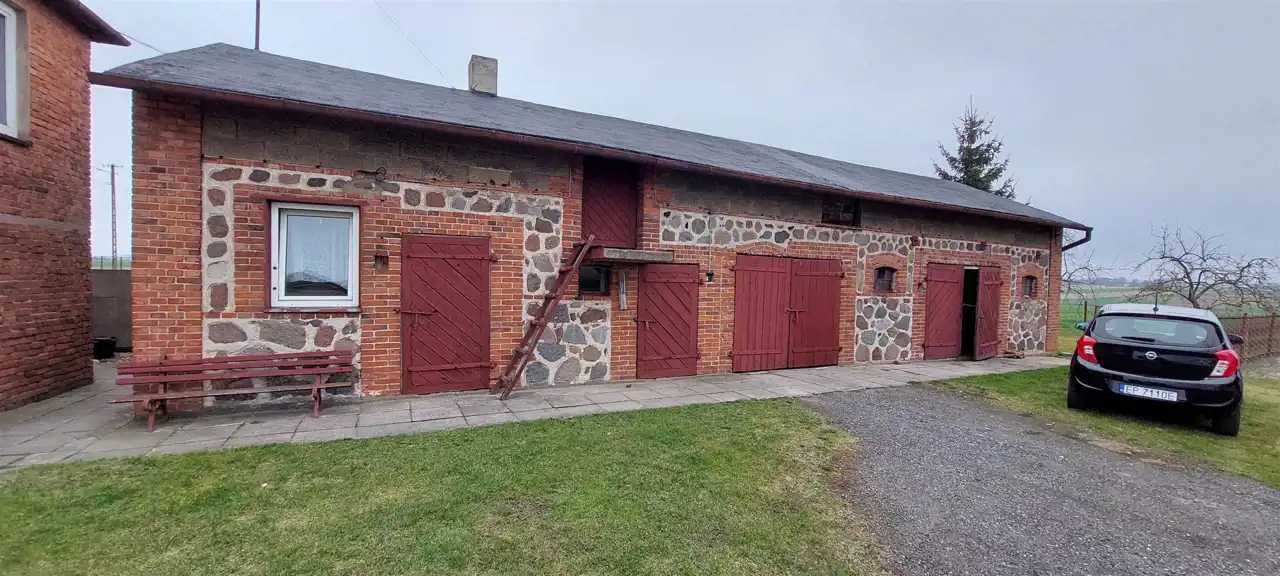Dach pokryty papą. Na posesji dodatkowo znajdują się budynki gospodarcze i garaż.