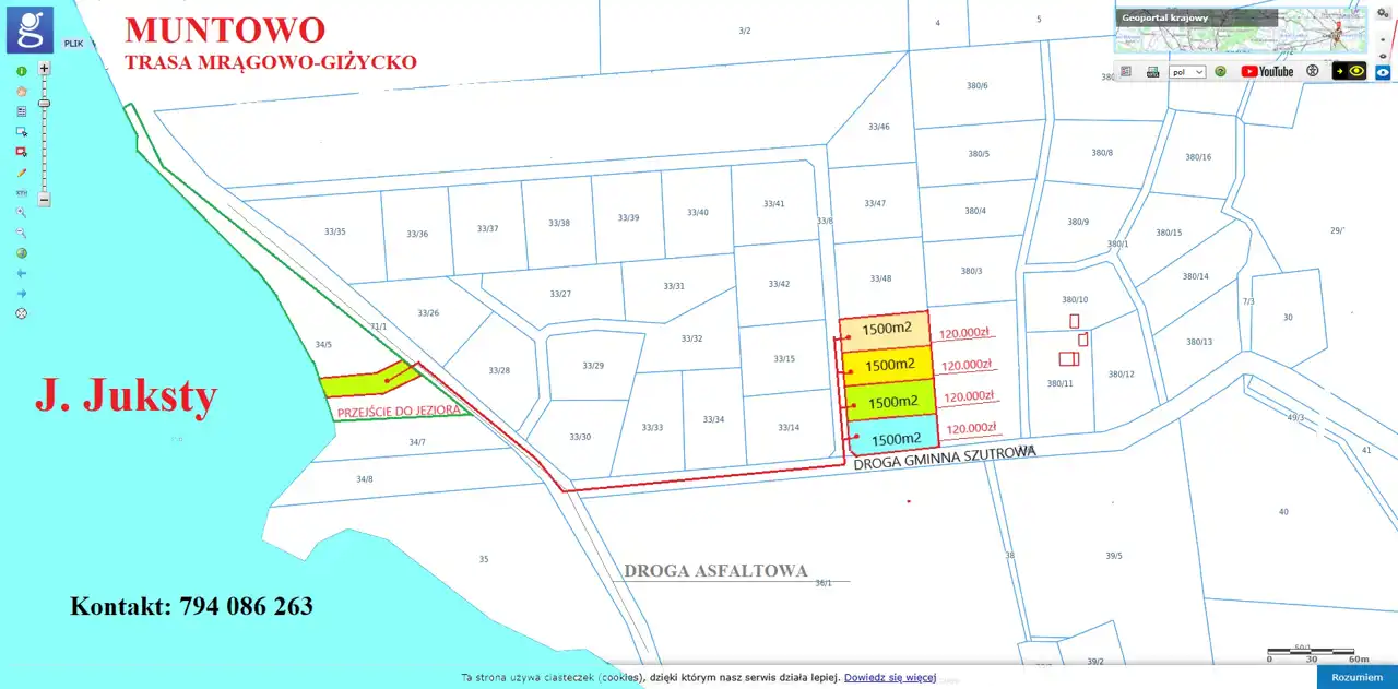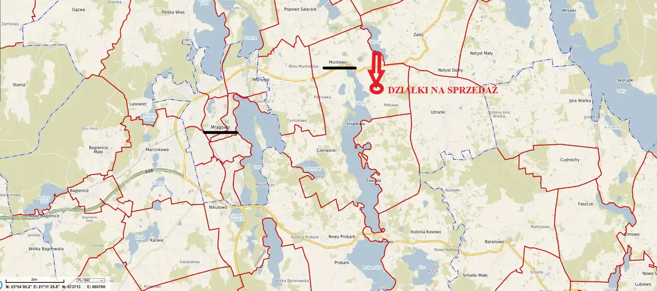 Na sprzedaż działka numer 33/54 o pow. 1505m2, w miejscowości Muntowo na trasie Mrągowo- Mikołajki z możliwością uzyskania WZ, oraz prawem dojścia do j.Juksty i korzystania z linii brzegowej (działka 356),. Dojazd do działki drogą gminną, przy której znajduję się wodociąg, sieć elektroenergetyczna w trakcie realizacji,