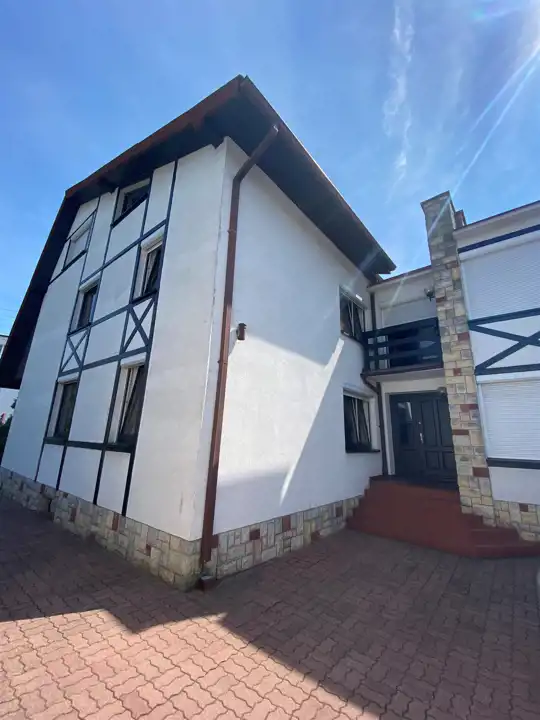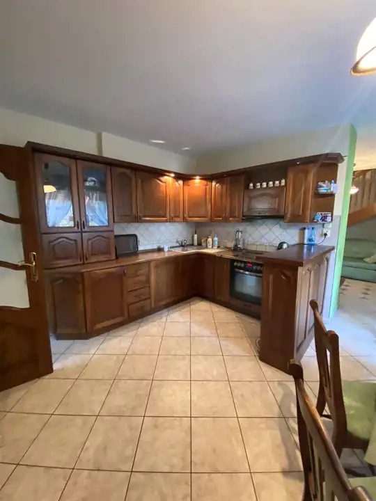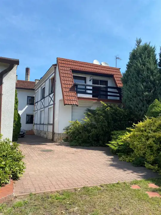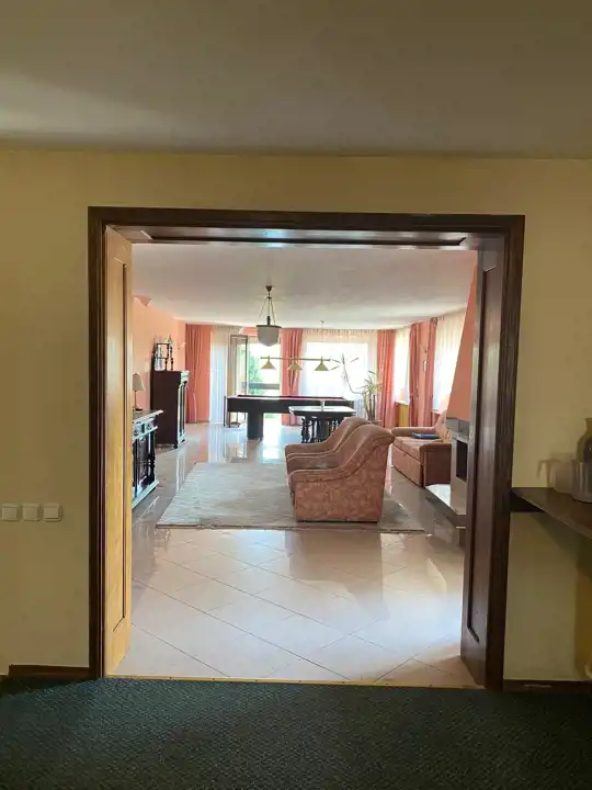 - Dom o powierzchni 340 m2 z krytym basenem o długości 7,30 m (sztuczna fala i urządzenie do masażu) oraz Sauną.