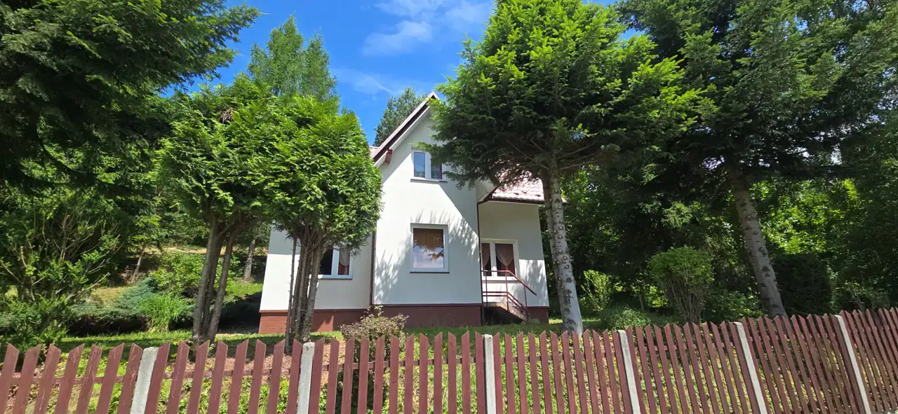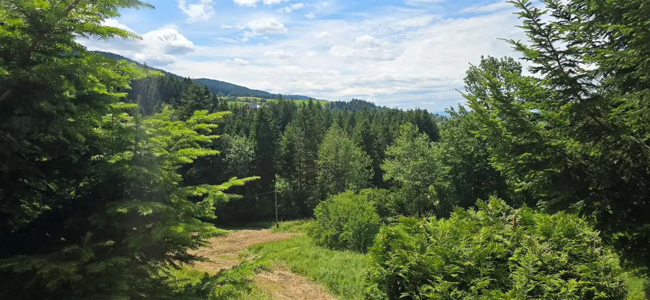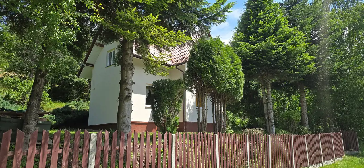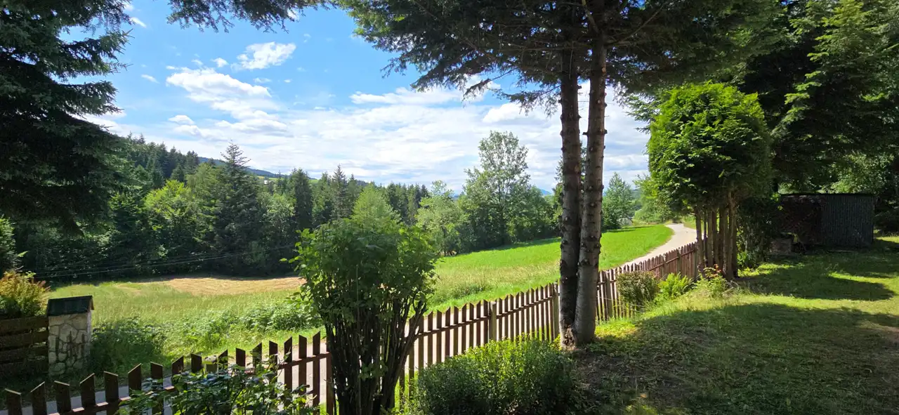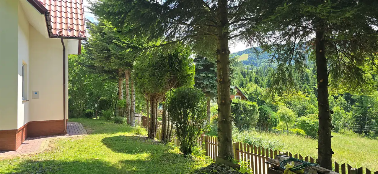 Działka o powierzchni 800 m² usytuowana jest na niewielkim wzniesieniu, z którego rozpościera się malowniczy widok na okoliczne góry i lasy. To miejsce pełne zieleni i zadrzewień – idealne do wypoczynku lub życia na stałe w otoczeniu natury.