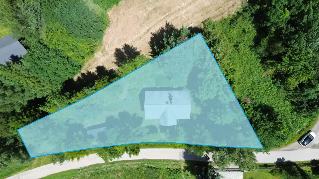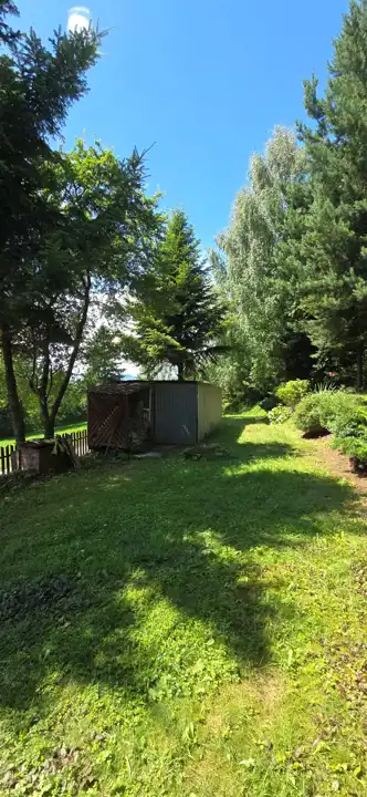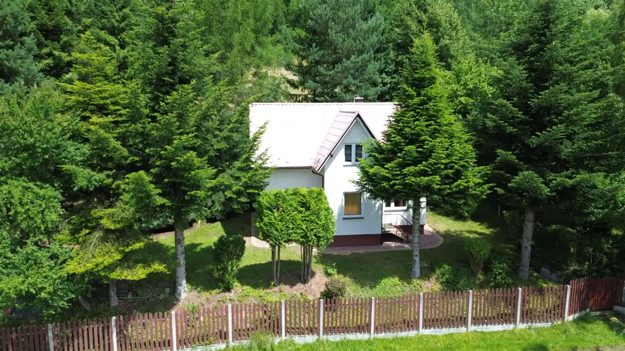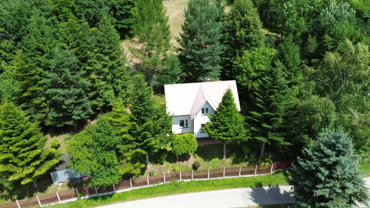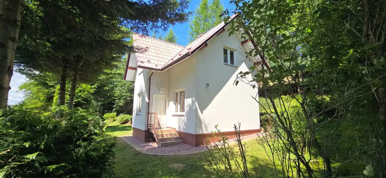Działka o powierzchni 800 m² usytuowana jest na niewielkim wzniesieniu, z którego rozpościera się malowniczy widok na okoliczne góry i lasy. To miejsce pełne zieleni i zadrzewień – idealne do wypoczynku lub życia na stałe w otoczeniu natury.