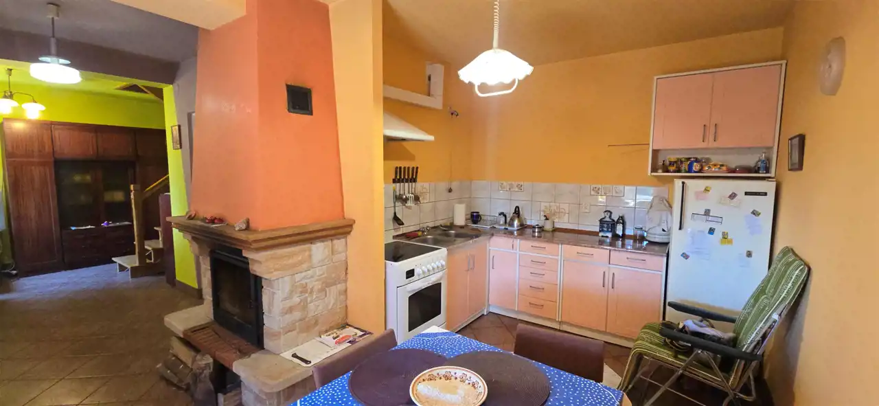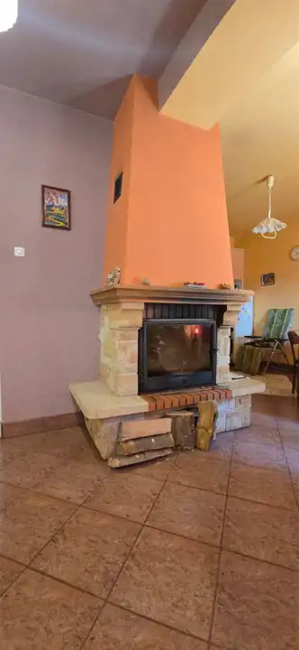 blachodachówką. Ogrzewanie za pomocą kominka z nadmuchem. Budynek posiada dwie kondygnacje.