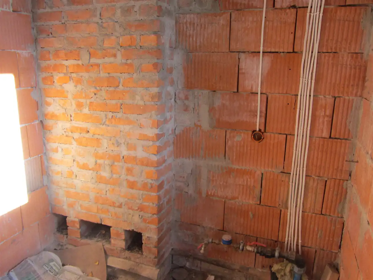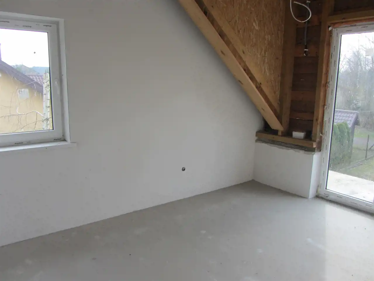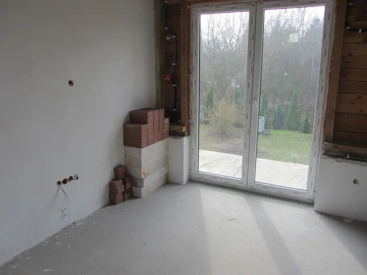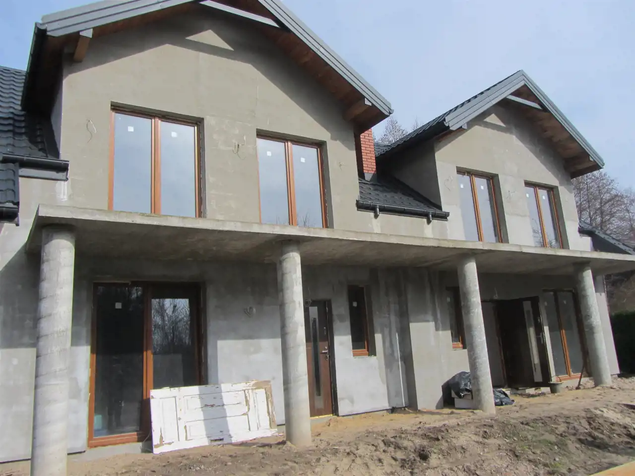 Jeden jest w stanie deweloperskim, drugi - stan surowy zamknięty. Każdy składa się z salonu połączonego z kuchnią plus łazienka i kotłownia. Na I piętrze są 3 sypialnie i łazienka. Rozciągnięta jest instalacja elektryczna, budynek ocieplony 15 centymetrową warstwą styropianu.