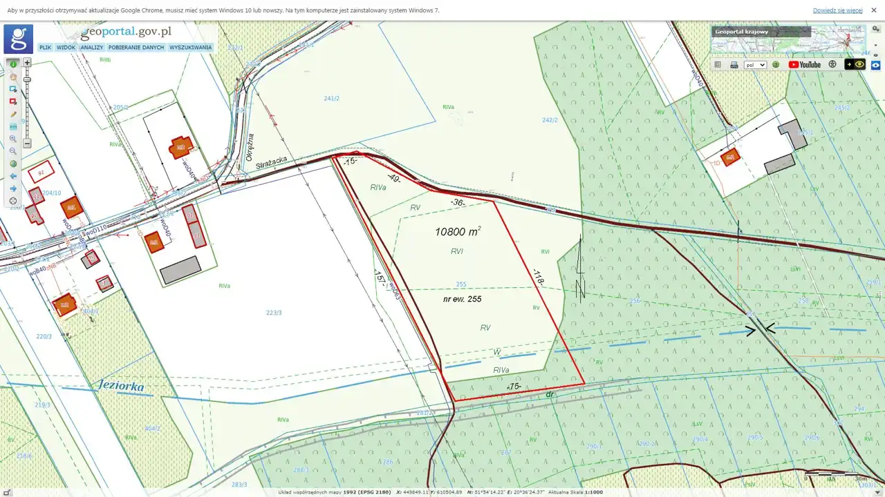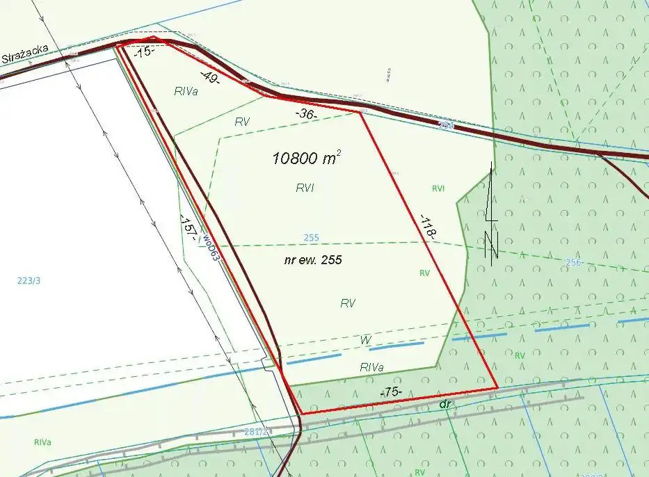 Działka siedliskowa, budowlano-rolna 10800 m2 w Osuchowie, gm. Mszczonów. Kształt trapezowy, szerokości 75 m, z wjazdem od północy. Położona przy gminnej, utwardzonej drodze, ul. Strażackiej. Przy działce lub w zasięgu prąd, wodociąg i światłowód. W planie zagospodarowania przestrzennego na pow. ok 3800m2 wzdłuż drogi zabudowa mieszkaniowa jednorodzinna i gospodarcza o pow. zab do 20%, wys. maks. 10 m z zachowaniem min 65% pow. biologicznie czynnej. W głębi działki tereny rolnicze bez prawa zabudowy. W rejestrze gruntów tereny rolne IV, V i VI kl, a także teren rowu W, który przebiega wzdłuż południowego boku.