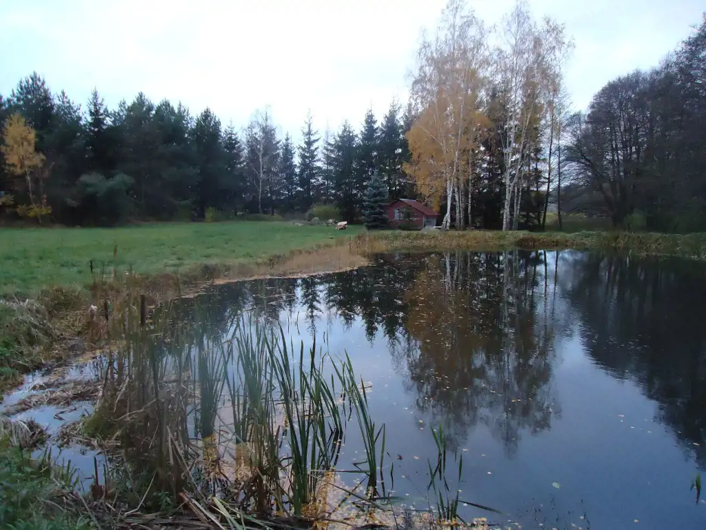 Działka w całości ogrodzona. Mieści się na niej niewielki domek letniskowy i duży staw.