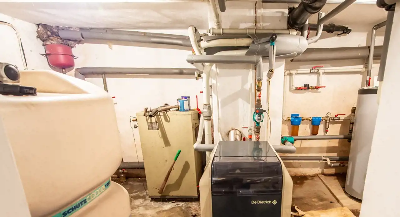W piwnicy – klatka schodowa zabiegowa w której zlokalizowano część techniczną. Urządzenia techniczne: kocioł stalowy na paliwo stałe, kocioł żeliwny na olej opałowy ze zbiornikiem na 1800l, ujęcie wody z sieci, pompy głębinowej, programator zraszaczy ogrodowych, podgrzewaczy c.w.u z instalacji grzewczej, elektryczny (100l), wodomierz, filtry oczyszczające wodę z sieci, licznik elektryczny, częściowa instalacja napełniająca paliwo z ujęcia zewnętrznego, możliwość przyłączenia do sieci kanalizacyjnej ogólnej w studzience ogólnej umiejscowionej na działce.