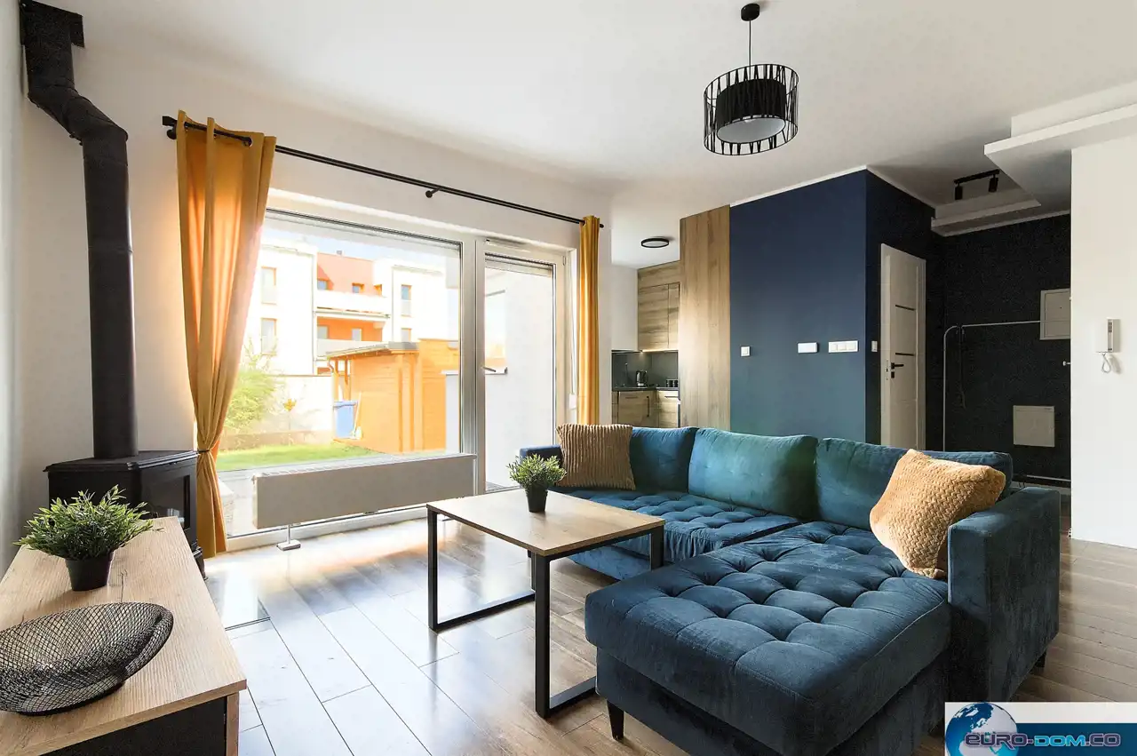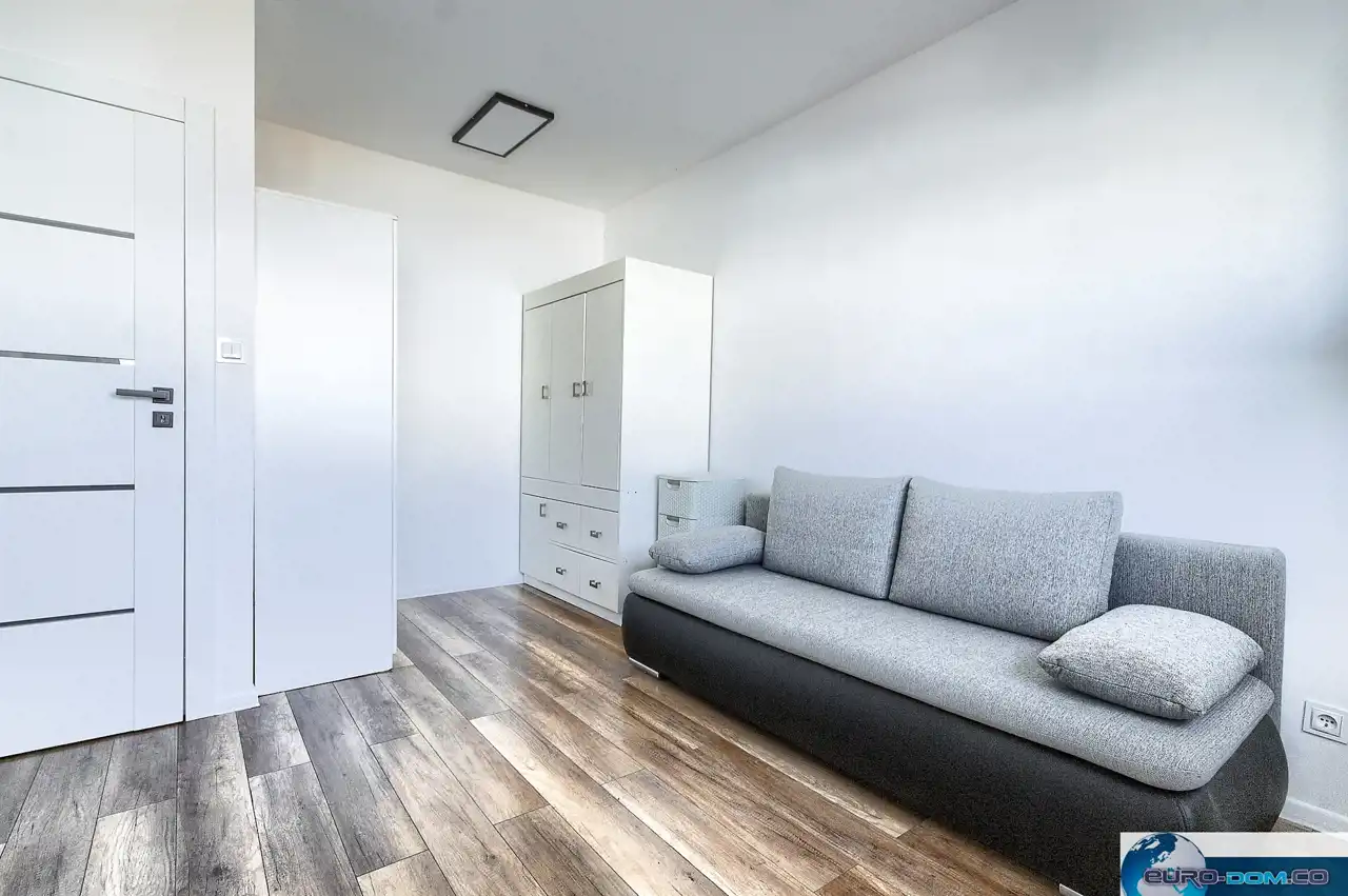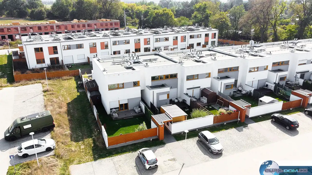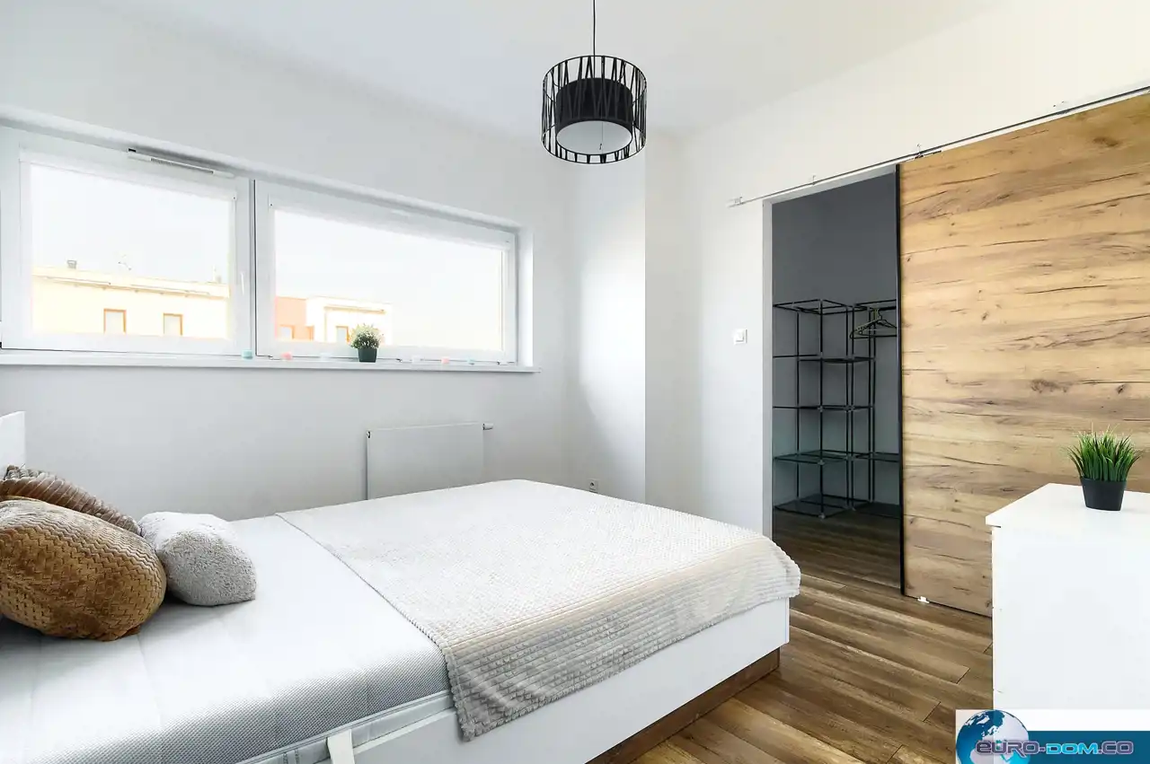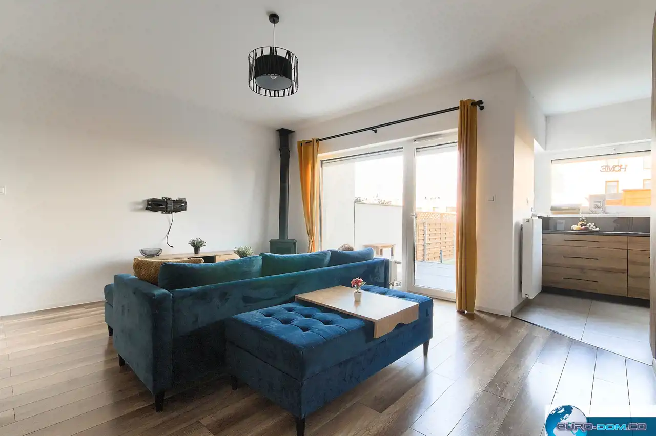 Szeregowiec o łącznej powierzchni 75 m2 w skład którego wchodzi przestronny salon, kuchnia i WC na parterze oraz dwie sypialnie z łazienką na piętrze. Do jednej z sypialni przynależy duża garderoba, co zapewnia duży komfort. Atutem nieruchomości jest duży ogródek, do którego jest wejście z salonu. Mieszkanie jest jasne dzięki dużym oknom, a w każdym oknie na parterze są zamontowane rolety zewnętrzne, co zapewnia komfort w upalne dni ale i prywatność. Kuchnia jest wyposażona we wszystkie niezbędne sprzęty AGD (zmywarka, piekarnik, płyta indukcyjna, okap). W salonie mamy wygodny narożnik i wyznaczoną jadalnie ze stołem i krzesłami. W jednej z sypialni znajduje się duże łóżko małżeńskie, a w drugiej rozkładana kanapa.