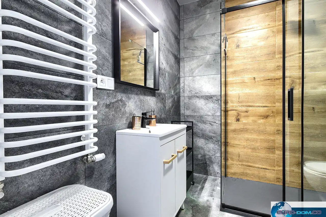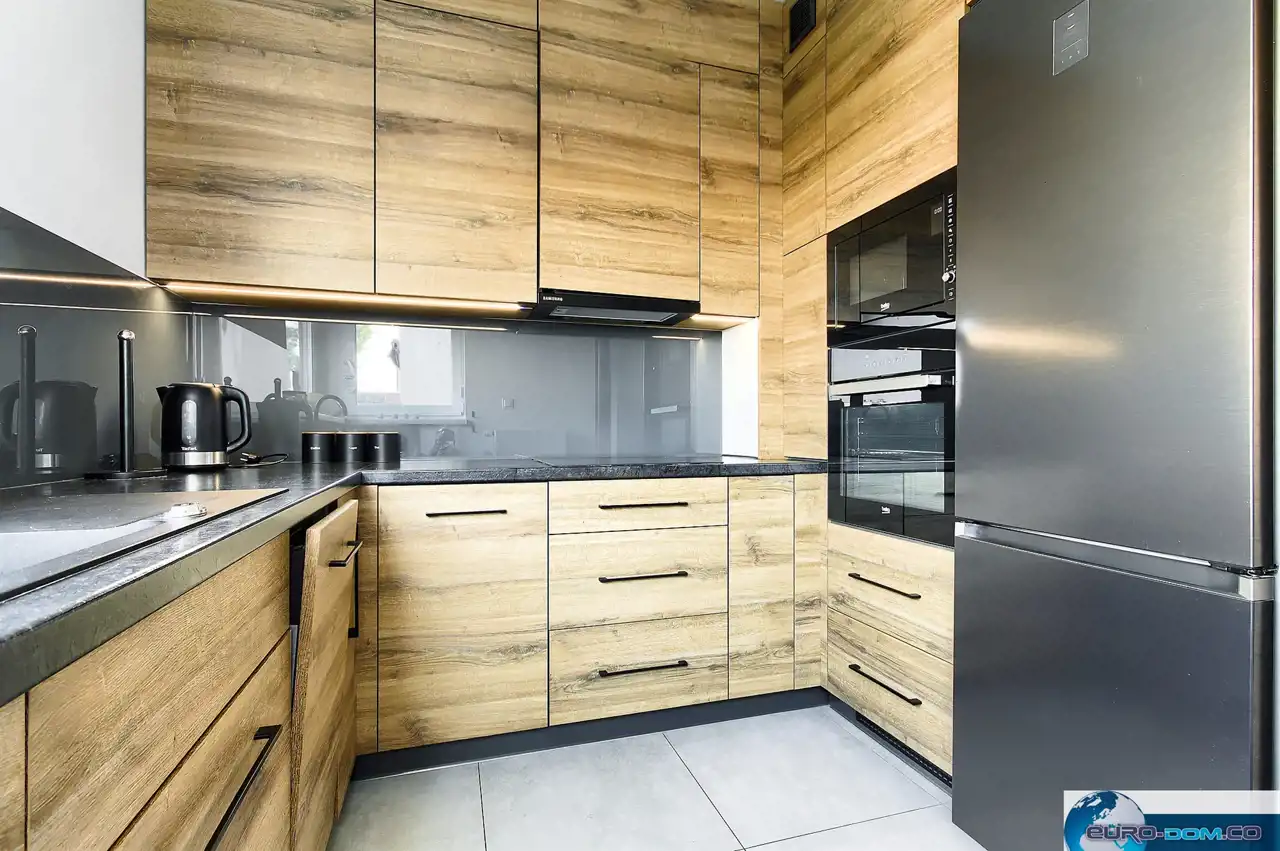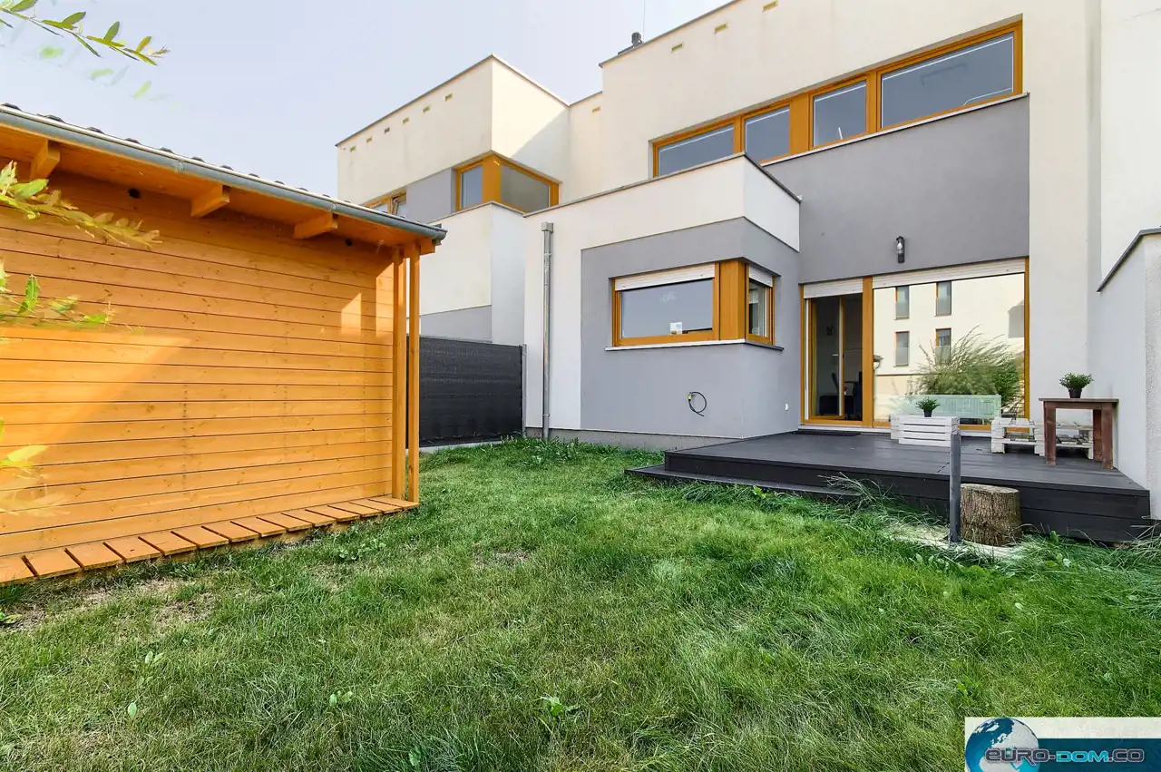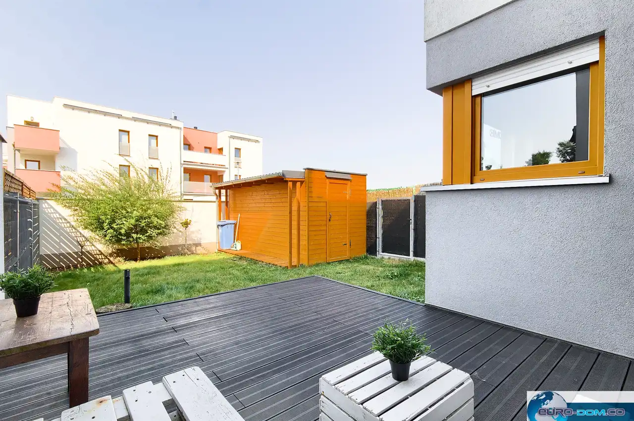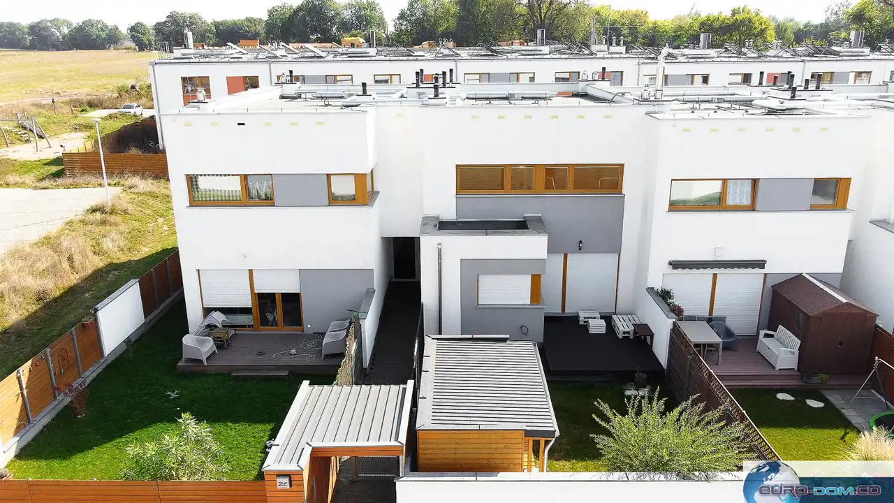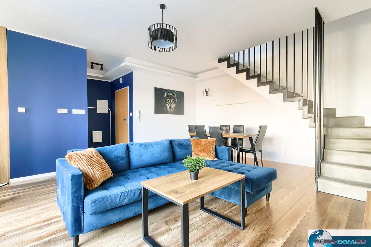 Szeregowiec o łącznej powierzchni 75 m2 w skład którego wchodzi przestronny salon, kuchnia i WC na parterze oraz dwie sypialnie z łazienką na piętrze. Do jednej z sypialni przynależy duża garderoba, co zapewnia duży komfort. Atutem nieruchomości jest duży ogródek, do którego jest wejście z salonu. Mieszkanie jest jasne dzięki dużym oknom, a w każdym oknie na parterze są zamontowane rolety zewnętrzne, co zapewnia komfort w upalne dni ale i prywatność. Kuchnia jest wyposażona we wszystkie niezbędne sprzęty AGD (zmywarka, piekarnik, płyta indukcyjna, okap). W salonie mamy wygodny narożnik i wyznaczoną jadalnie ze stołem i krzesłami. W jednej z sypialni znajduje się duże łóżko małżeńskie, a w drugiej rozkładana kanapa.