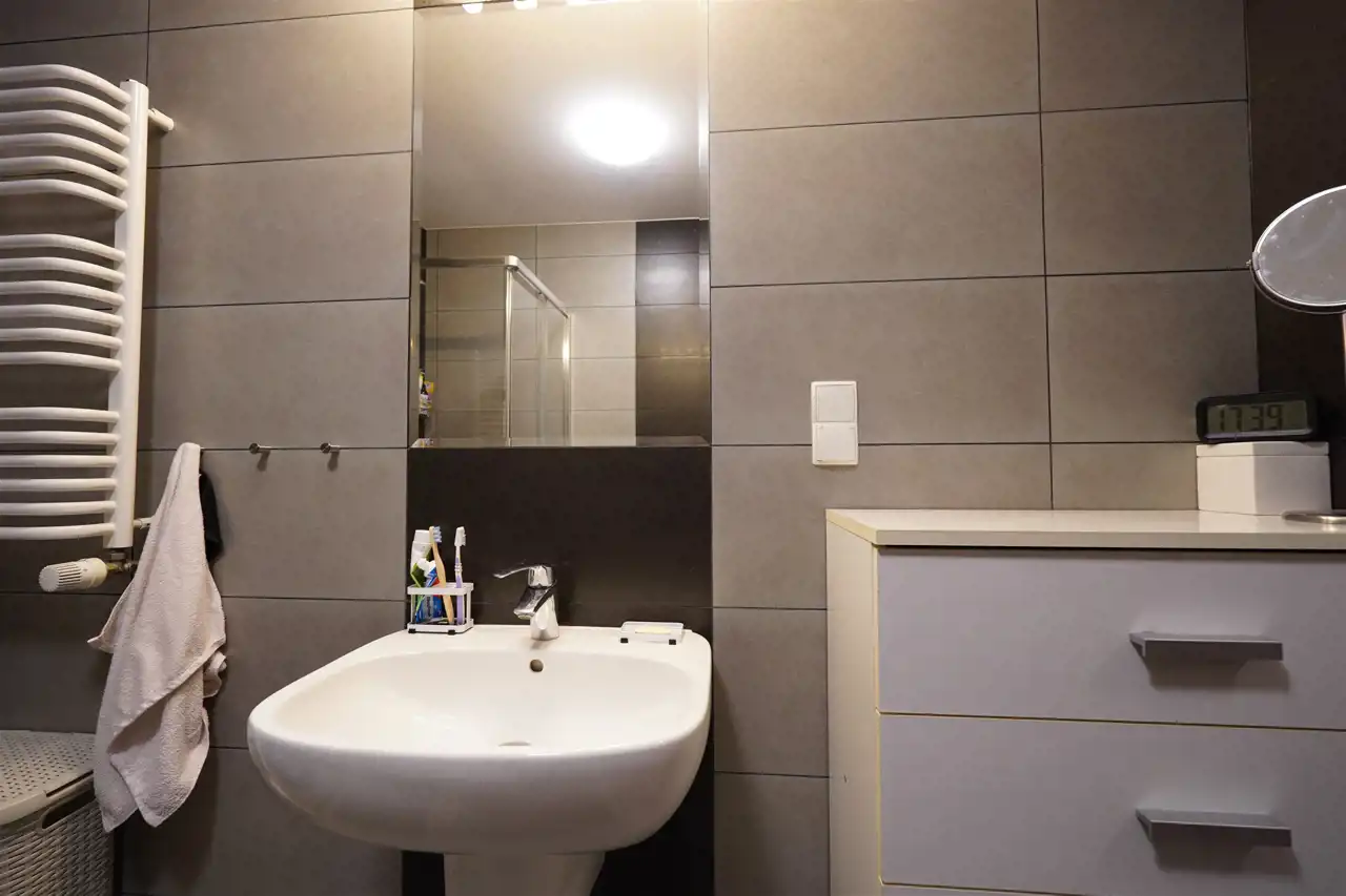 Na podłodze w salonie panele podłogowe, w łazience płytki.