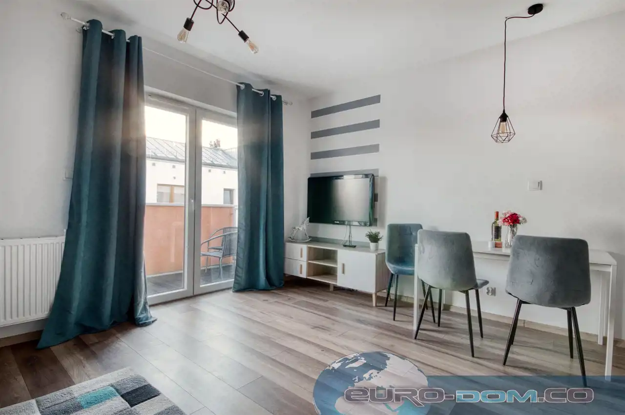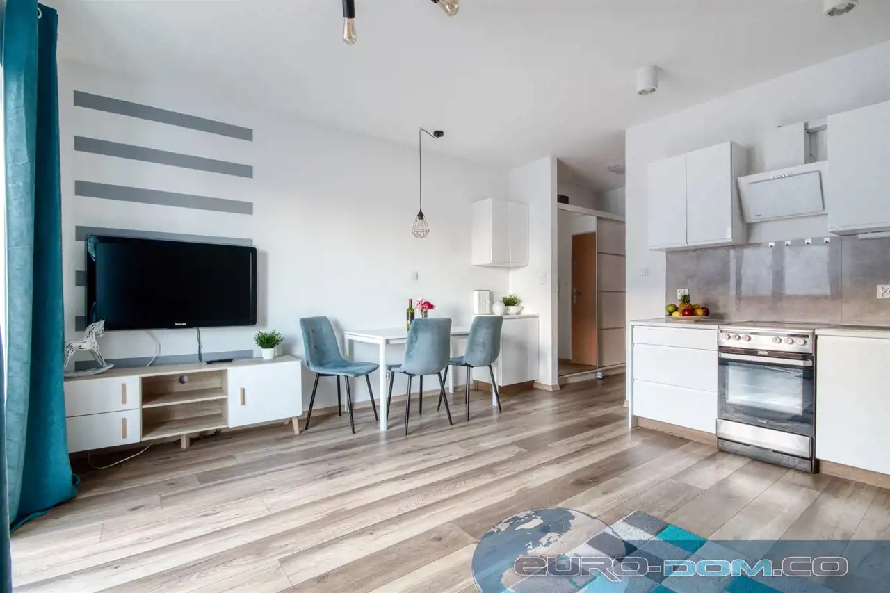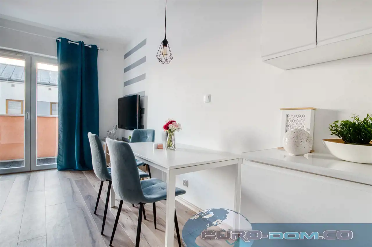 Kawalerka została wykończona i w pełni wyposażona w marcu 2022 roku. Mieszkanie jest jasne, funkcjonalne i gotowe do zamieszkania. Kuchnia wyposażona jest we wszystkie niezbędne sprzęty AGD, w tym lodówkę, płytę grzewczą, okap oraz pralkę. W części dziennej znajduje się szafka RTV, stół z krzesłami, komoda, szafa oraz telewizor. Z salonu prowadzi wyjście na duży balkon, a duże okna zapewniają bardzo dobre doświetlenie wnętrza. Łazienka została nowocześnie wykończona i wyposażona w wannę z funkcją prysznica oraz szklaną zasłoną.