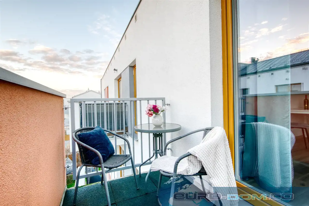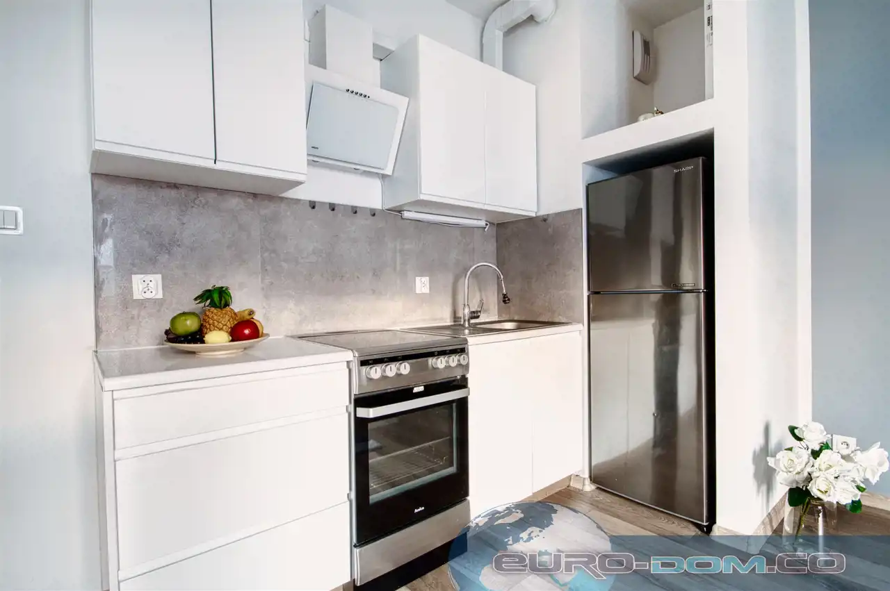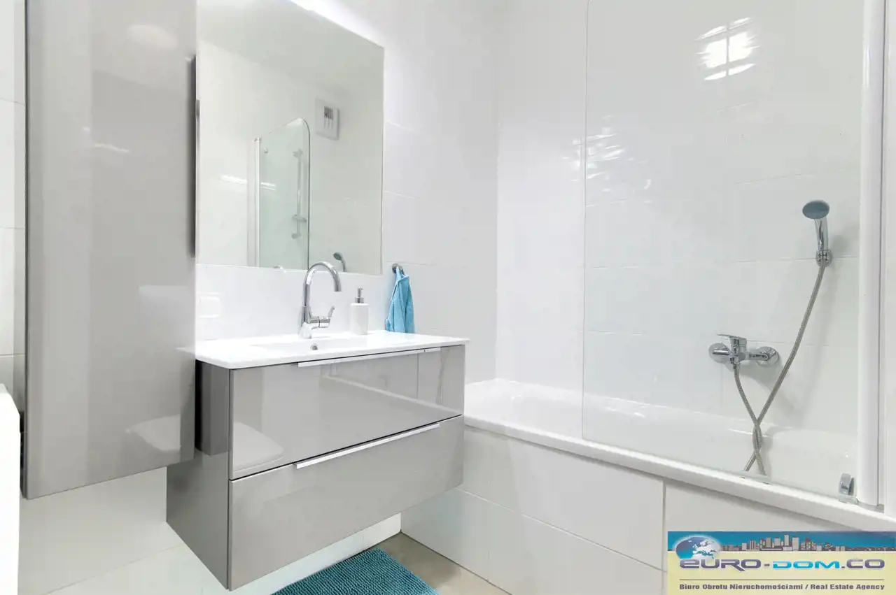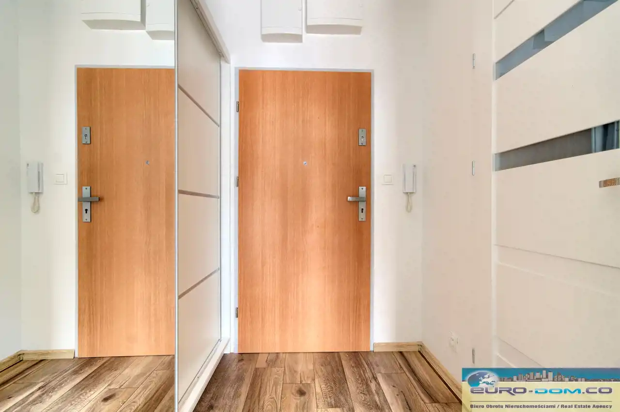 Kawalerka została wykończona i w pełni wyposażona w marcu 2022 roku. Mieszkanie jest jasne, funkcjonalne i gotowe do zamieszkania. Kuchnia wyposażona jest we wszystkie niezbędne sprzęty AGD, w tym lodówkę, płytę grzewczą, okap oraz pralkę. W części dziennej znajduje się szafka RTV, stół z krzesłami, komoda, szafa oraz telewizor. Z salonu prowadzi wyjście na duży balkon, a duże okna zapewniają bardzo dobre doświetlenie wnętrza. Łazienka została nowocześnie wykończona i wyposażona w wannę z funkcją prysznica oraz szklaną zasłoną.