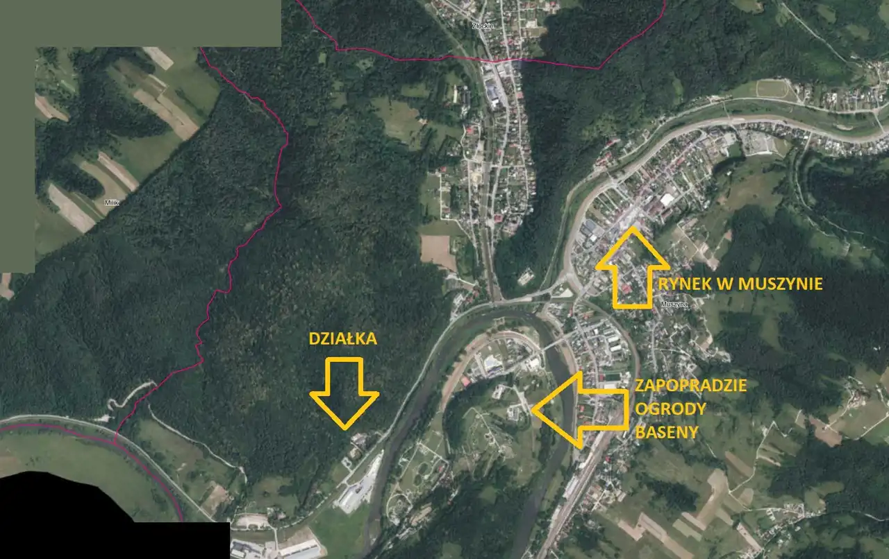 Działka położona jest w spokojnej, a zarazem strategicznej części Muszyny – w pobliżu znajdują się: