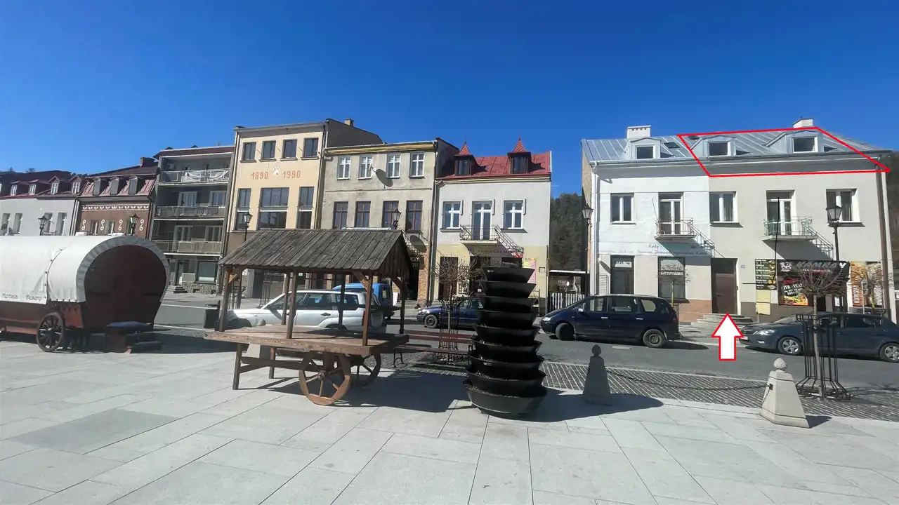 Lokal posiada powierzchnię niespełna 50m/kw i składa się z dwóch pokoi, jeden przechodni oraz oddzielnej sypialni o wystawie północnej z widokiem na górę Baszta. Kuchnia otwarta na pokój, z aneksem kuchennym. Widok z okna kuchennego na płytę rynku. Łazienka z prysznicem. oraz niewielki przedpokój.