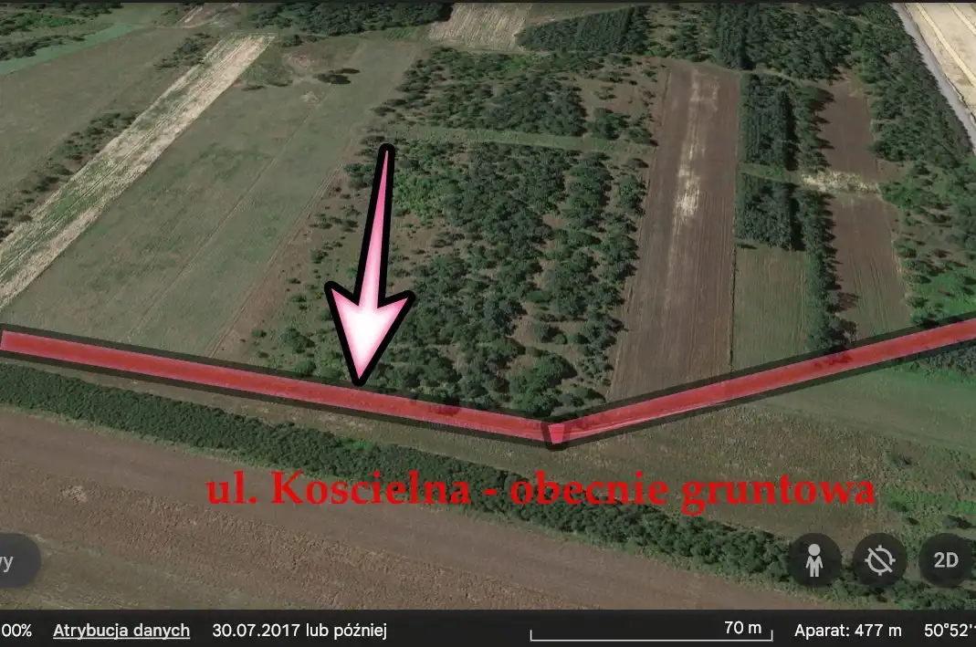 Nieruchomość położona jest przy drodze gminnej nieurządzonej - ul. Kościelna. To duży potencjał inwestycyjny - w pobliży wydzielane są nowe działki budowlane.