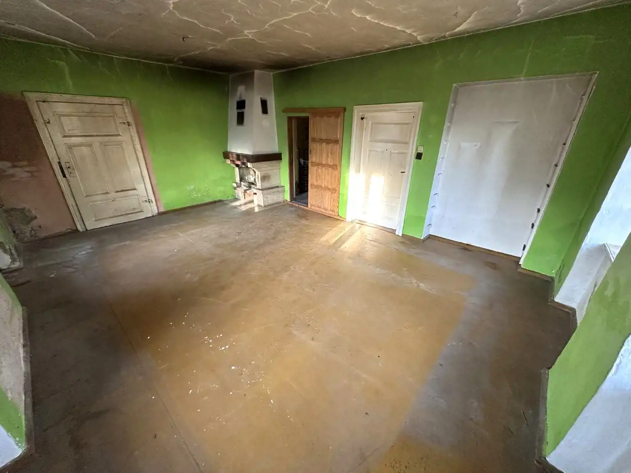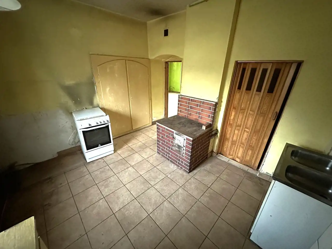 - duży pokój 26m2 z kuchnią kaflową i zlewem (jest rozprowadzenie ciepła z kominka na parterze)