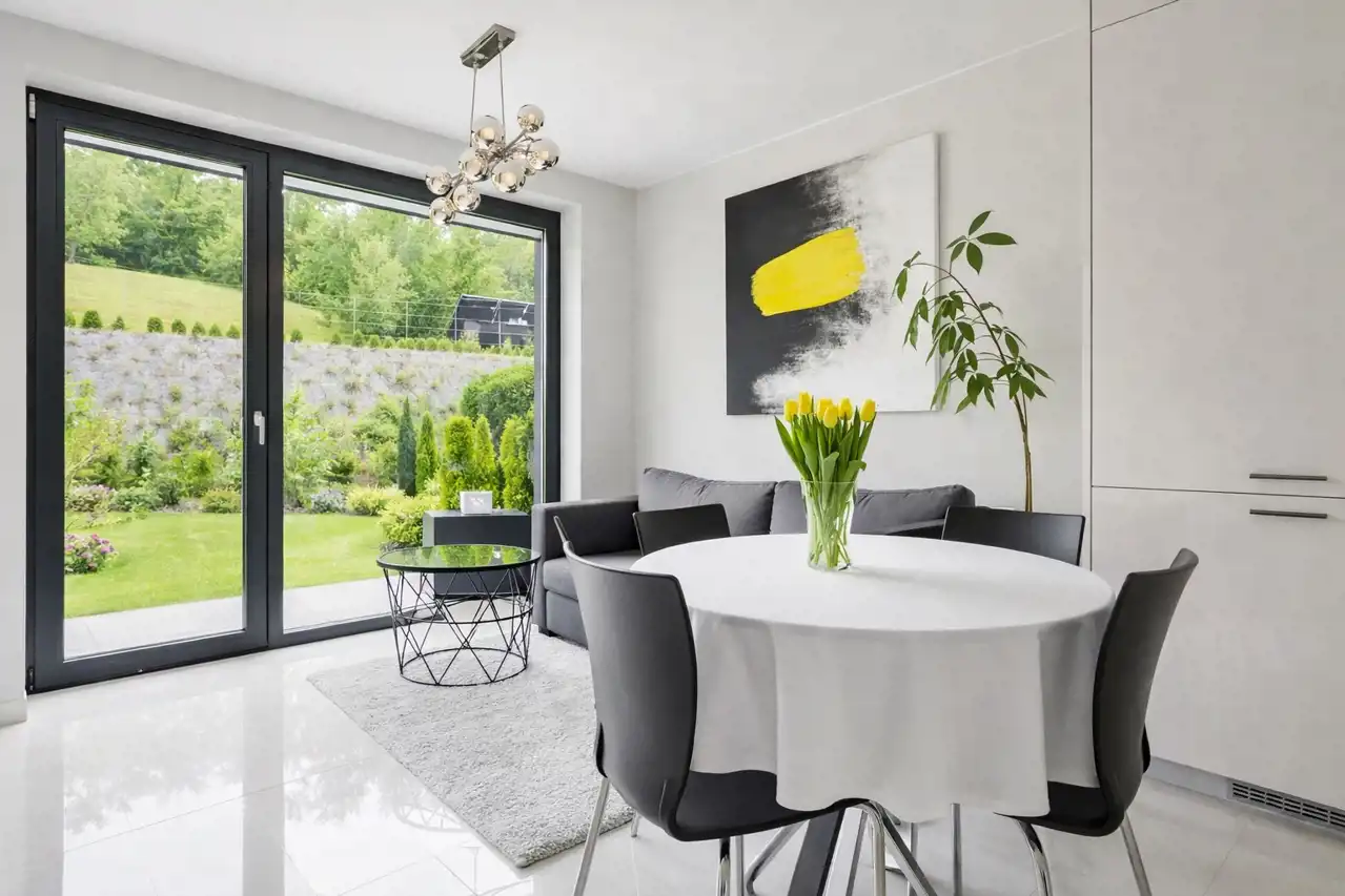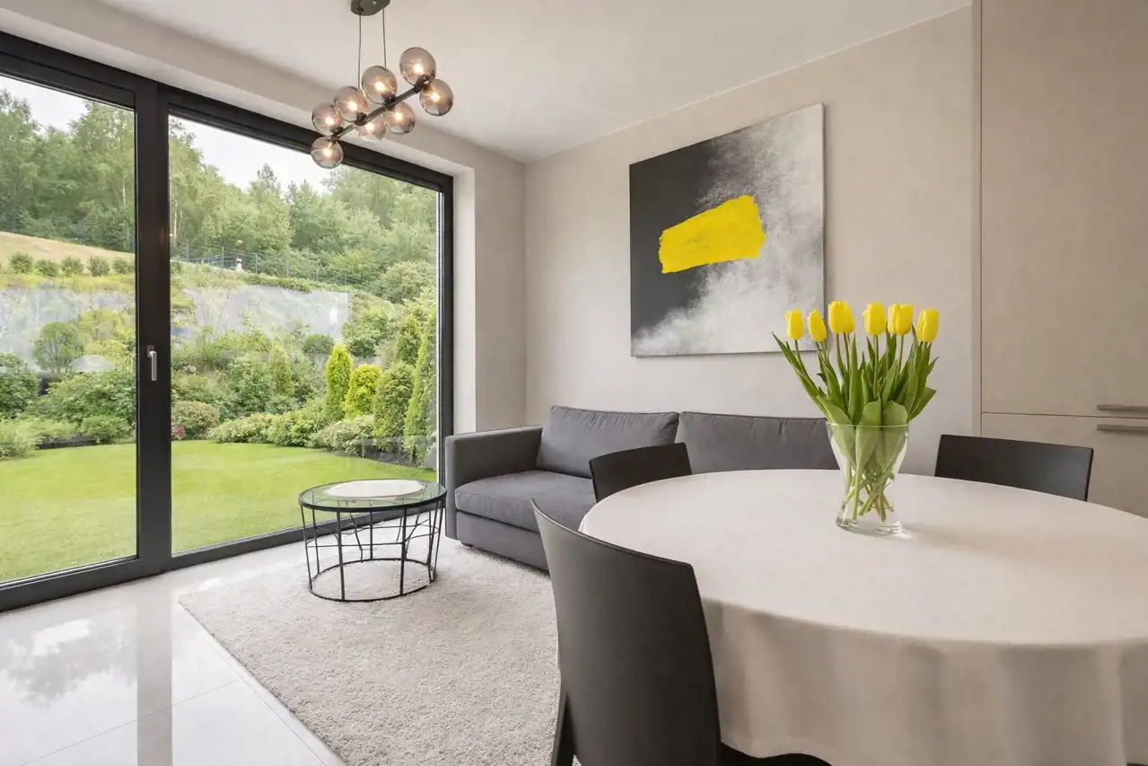 Niezwykły efekt tworzą panoramiczne okna, dom jest wspaniale doświetlony, jasny i przyjemny, przestrzenny i funkcjonalny.