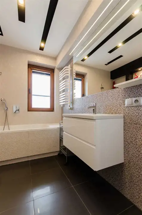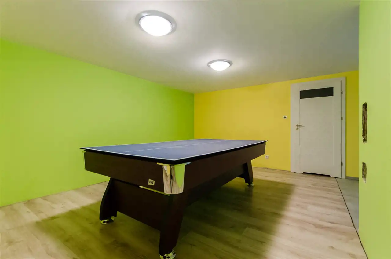 - pokój rekreacyjny (miejsce odpoczynku, relaksu i izolacji od świata ze stołem bilardowym i opcjonalnie innymi formami rozrywki np. konsola, gry w pokera itp) łazienka, piwnica, kotłownia, kuchnia letnia oraz garaż na 2 samochody.