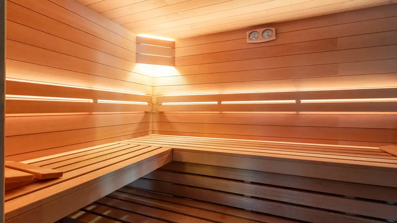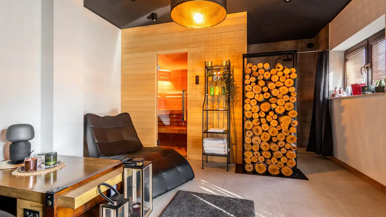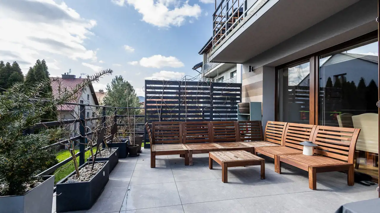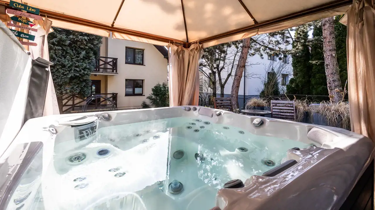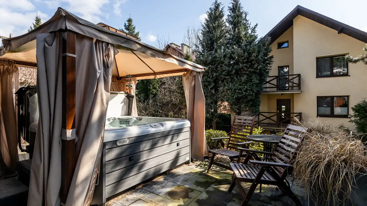 Z pomieszczenia z sauną wyjście na taras na którym umiejscowione jest jacuzzi ogrodowe.