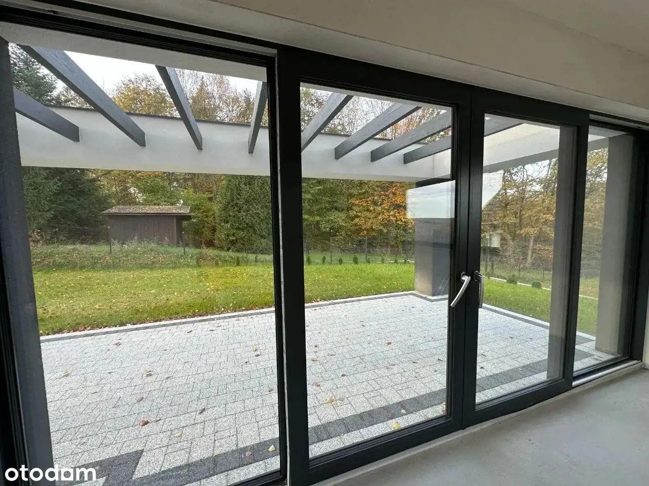 Prosta bryła budynku, której atrakcyjności dodają duże przeszklenia, głownie zastosowane w części dziennej ale również w garażu i pom. gospodarczym. Pomieszczenia są doskonale doświetlone, co jest dodatkowym źródłem naturalnego ciepła, szczególnie w okresie jesienno - zimowym. W salonie zastosowano podwójne, rozsuwane drzwi aluminiowe typu Smart Slide, które po otworzeniu dają przestrzeń do wyjścia o szer. niespełna 2.5 m i płynnie łączą wnętrze domu z przestronnym tarasem, który w okresie wiosenno - letnim, jest niezbędnym miejscem do funkcjonowania.