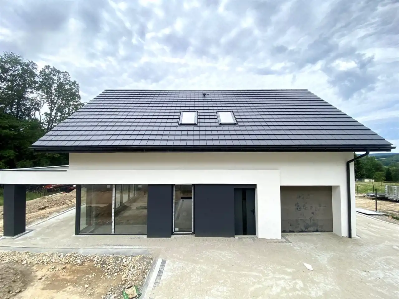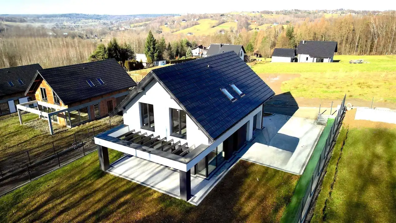 Dach przykryty dachówką ceramiczną płaską w kolorze antracyt.