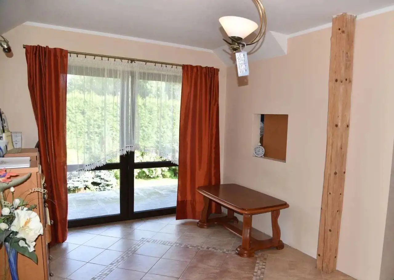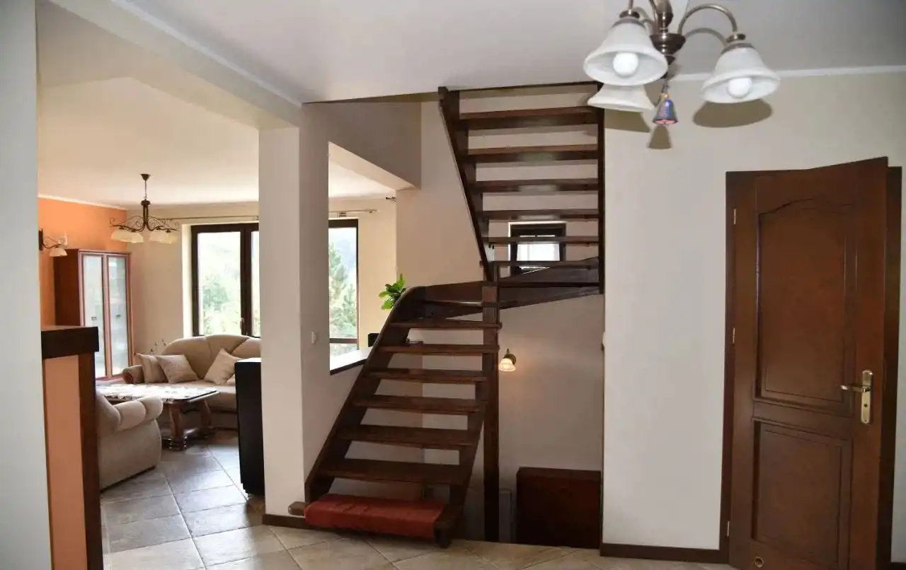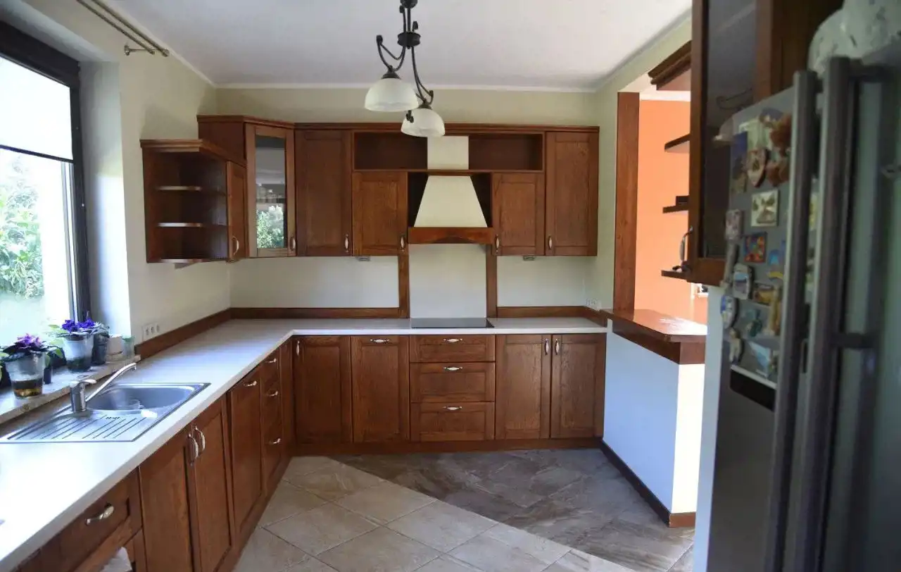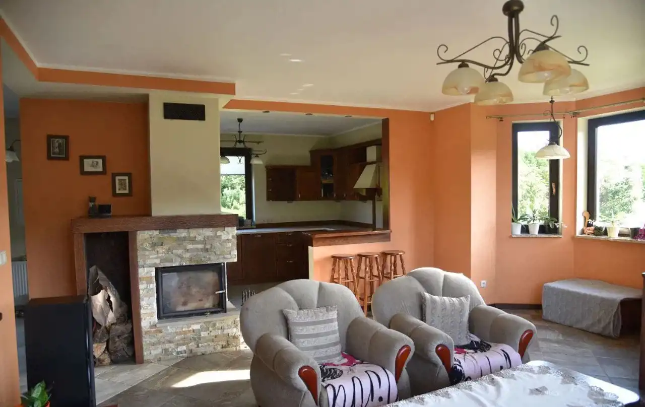 Dom jest w dobrym stanie, w pokojach i na korytarzu na podłogach panele, a w łazienkach i na parterze terakota. Kuchnia umeblowana na wymiar i wyposażona w sprzęt AGD, na ścianach glazura. W łazienkach kabina prysznicowa i zabudowana wanna, na ścianach glazura. W pozostałych pomieszczeniach na ścianach gładzie gipsowe. Ogrzewanie i ciepła woda z piecyka gazowego dwufunkcyjnego z podwójną komorą spalania. Okna PCV, drzwi wejściowe antywłamaniowe. W domu zainstalowana jest fotowoltaika.