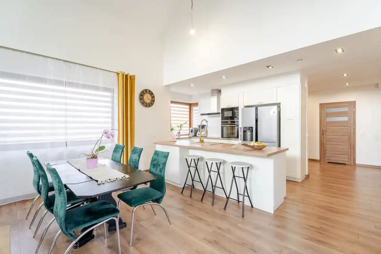 Dużym atutem jest funkcjonalny układ pomieszczeń, który sprawdzi się zarówno dla rodziny z dziećmi, jak i osób pracujących zdalnie.
