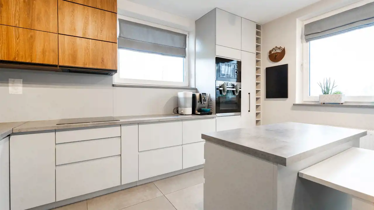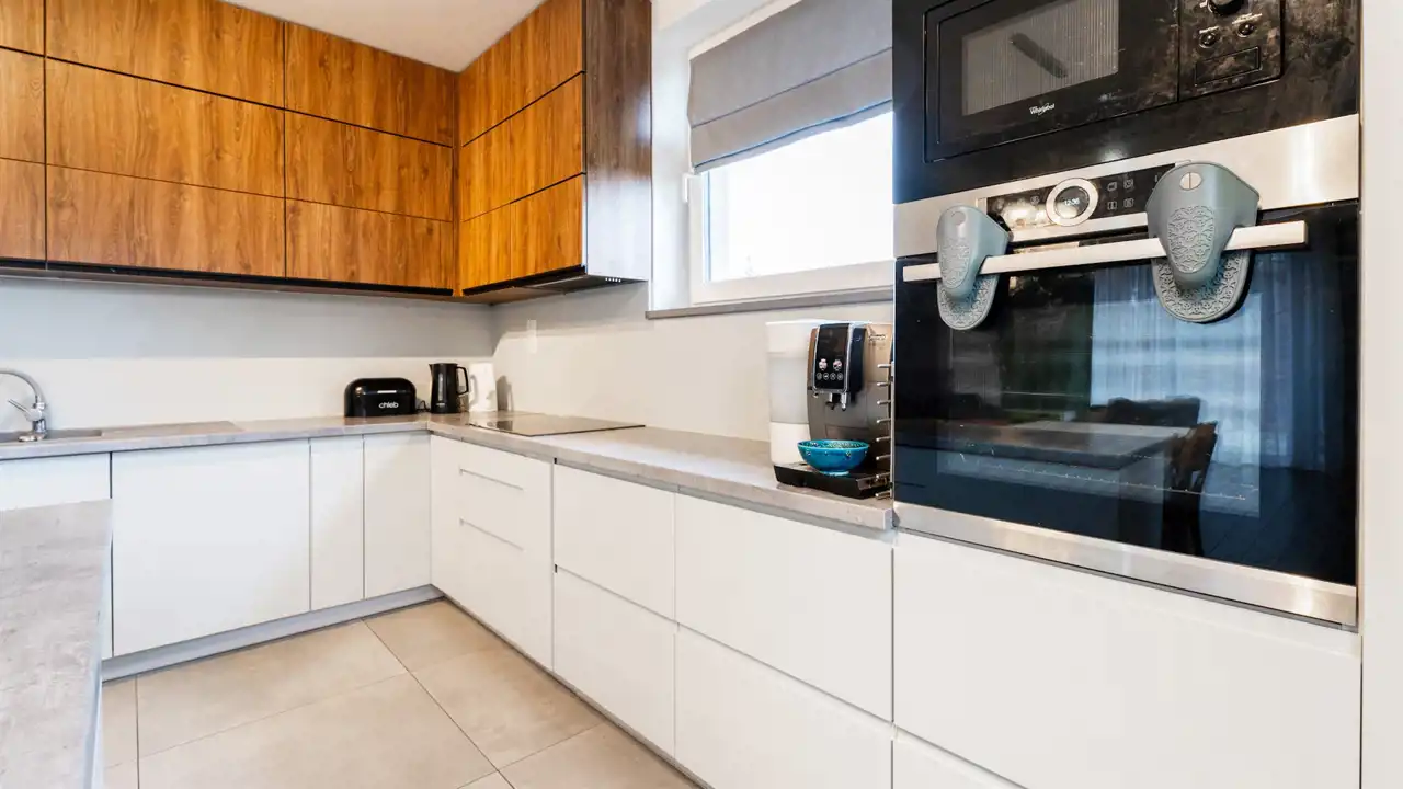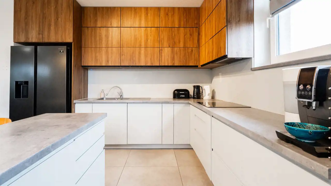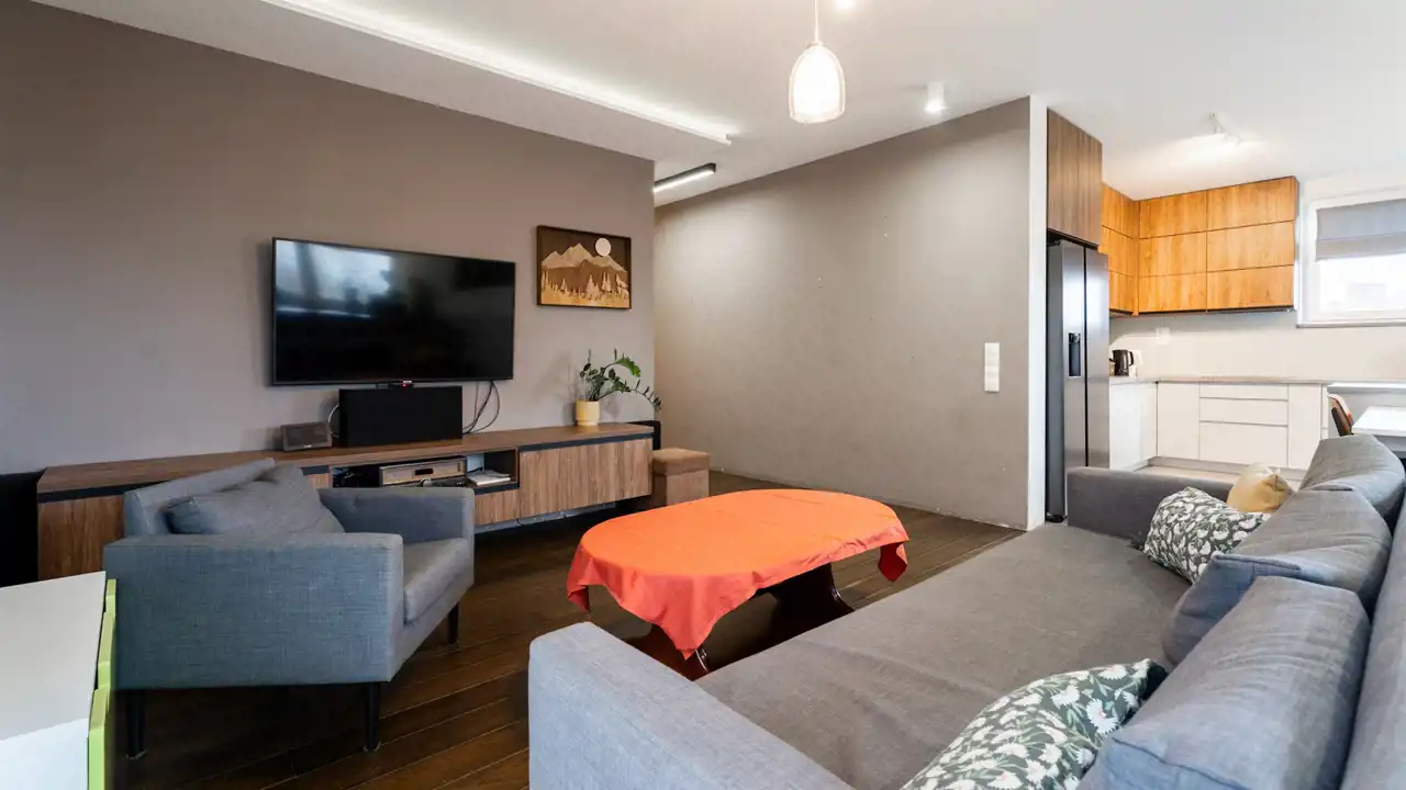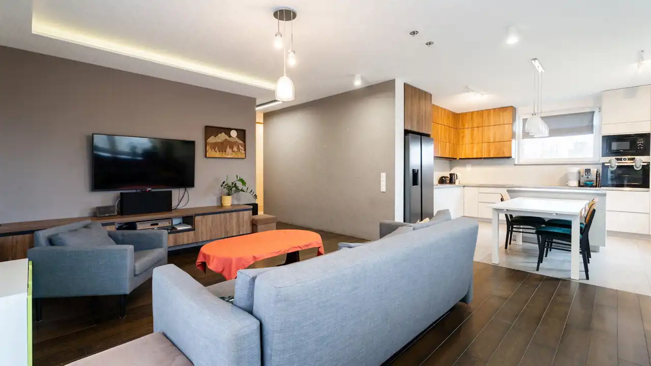 - Salon z nowocześnie wyposażonym aneksem kuchennym. Przed wejściem do salonu jest duży taras.