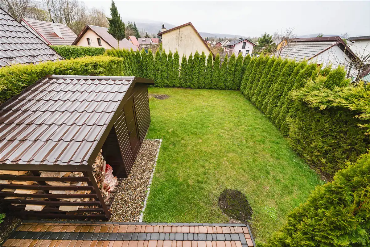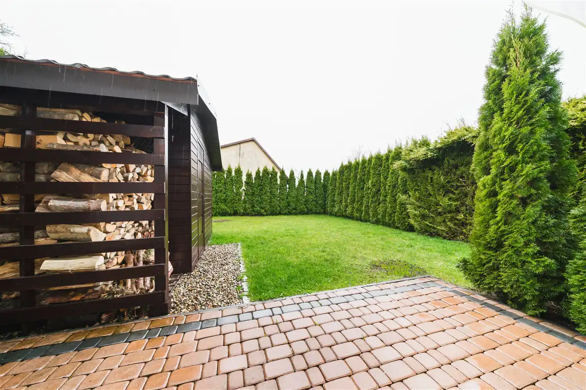 Na działce znajduje się wyrośnięta roślinność oraz drewutnia.