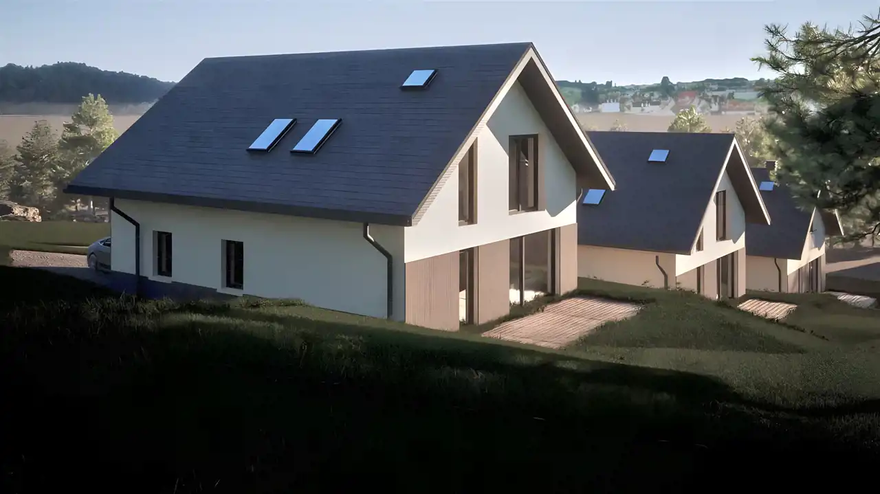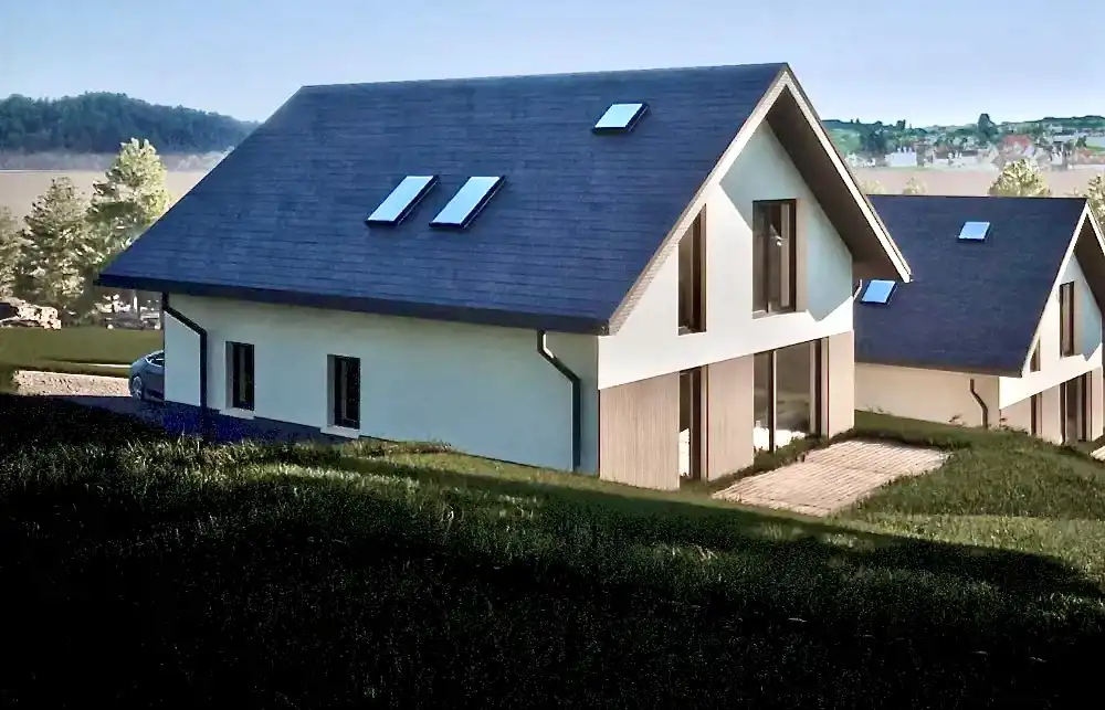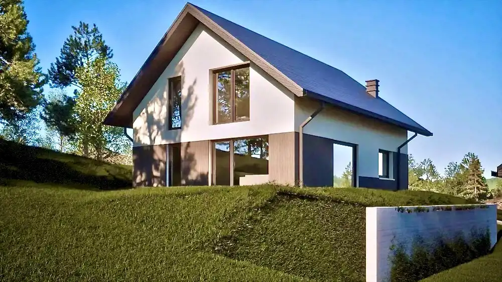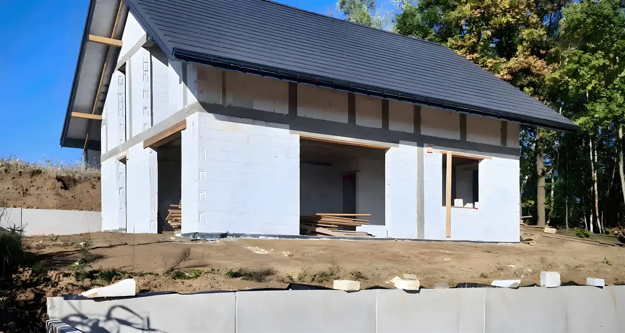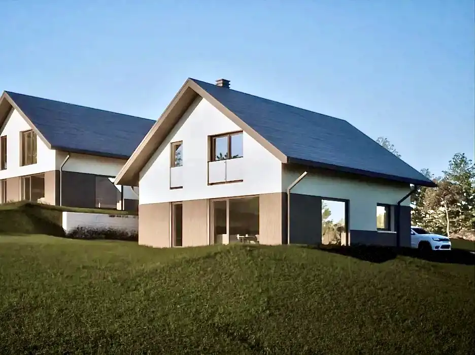Budynek o powierzchni 134,5m2 murowany z bloczka z betonu komórkowego Termobet, kryty niemiecką dachówką płaską Nelskamp Planum.