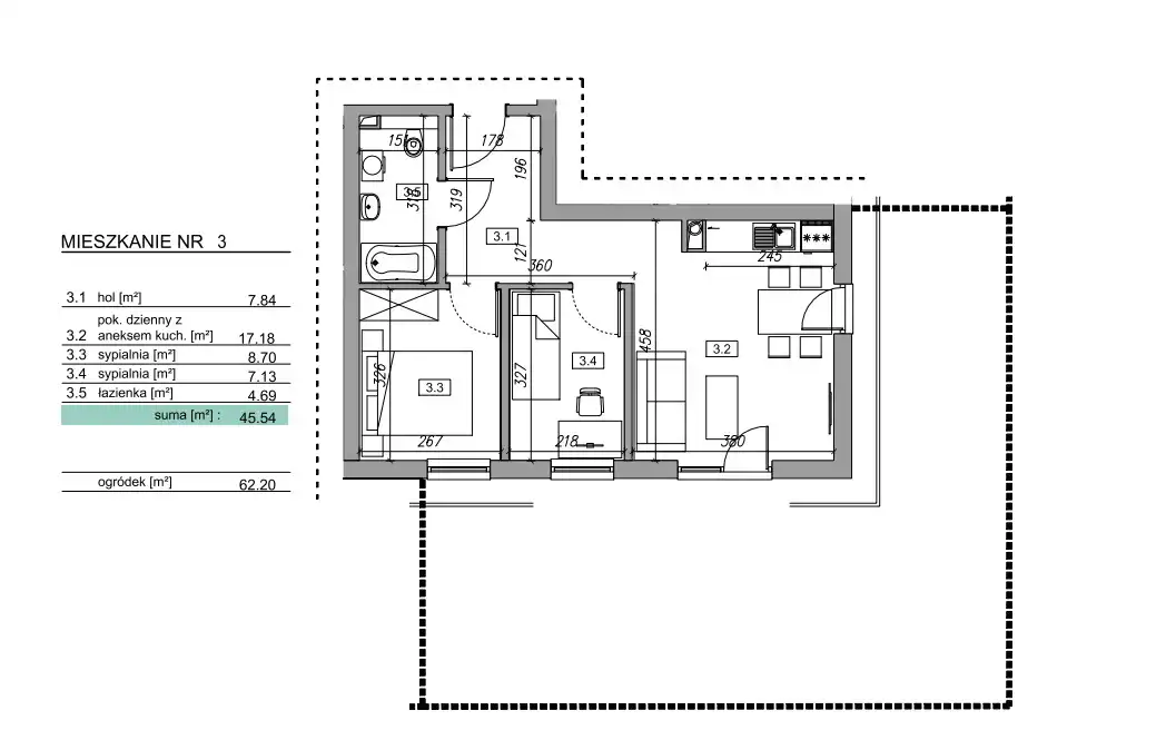 - Charakterystyka mieszkania 45.54 m2, 3 pokoje
