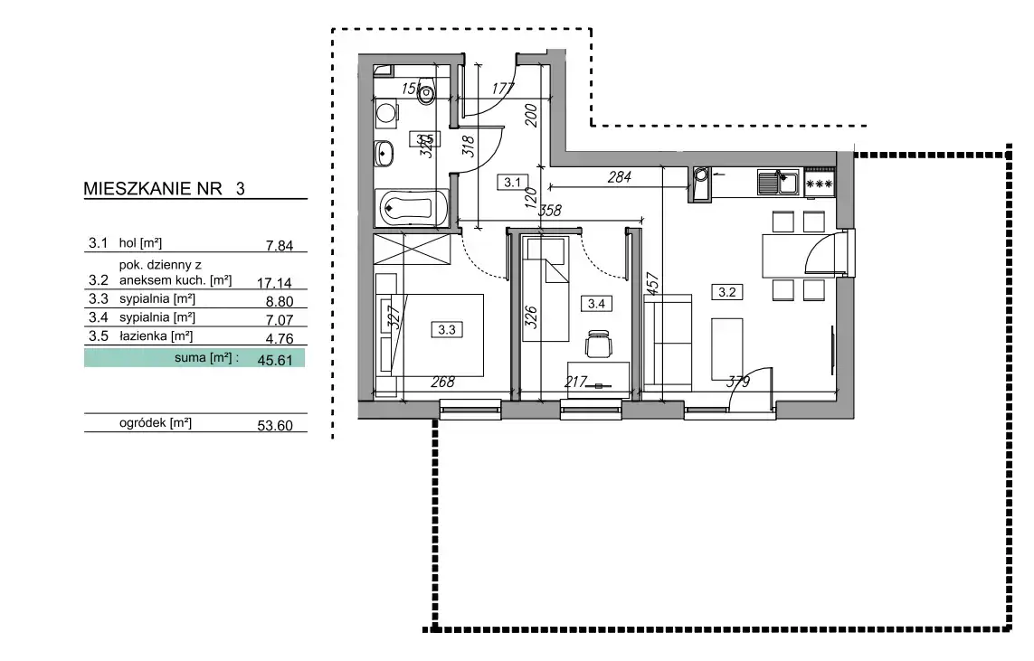 - Charakterystyka mieszkania 45.61 m2, 3 pokoje