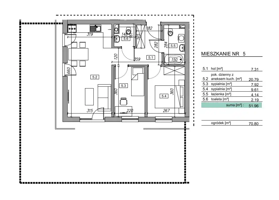 - Charakterystyka mieszkania 51.96 m2, 3 pokoje
