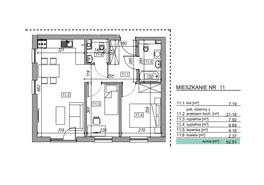 - Charakterystyka mieszkania 52.51 m2, 3 pokoje