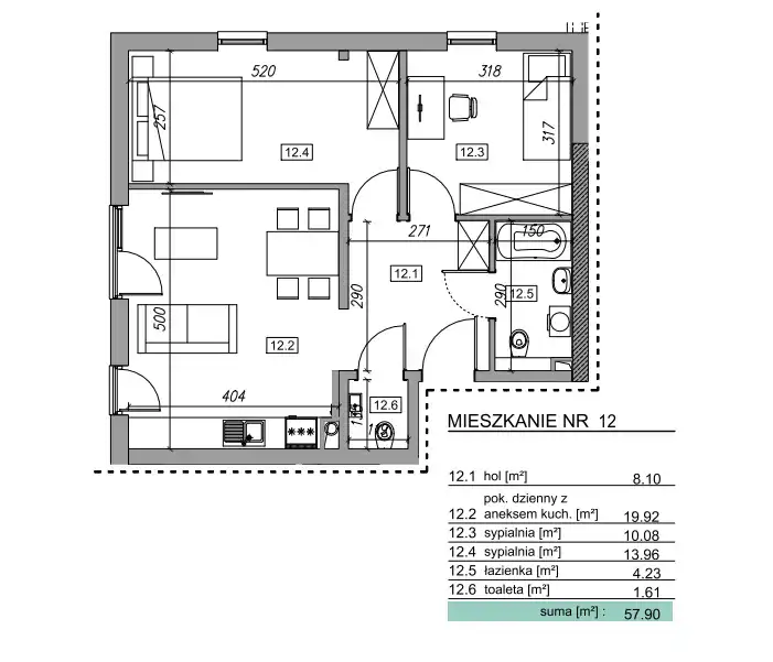 - Charakterystyka mieszkania 57.9 m2, 3 pokoje