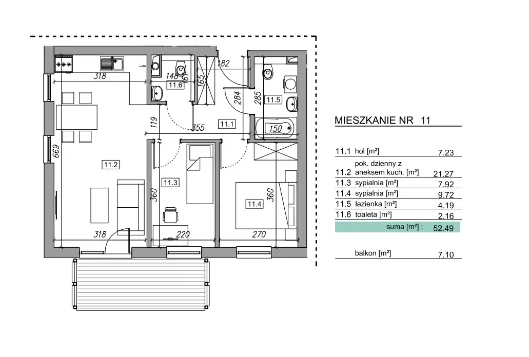 - Charakterystyka mieszkania 52.49 m2, 3 pokoje