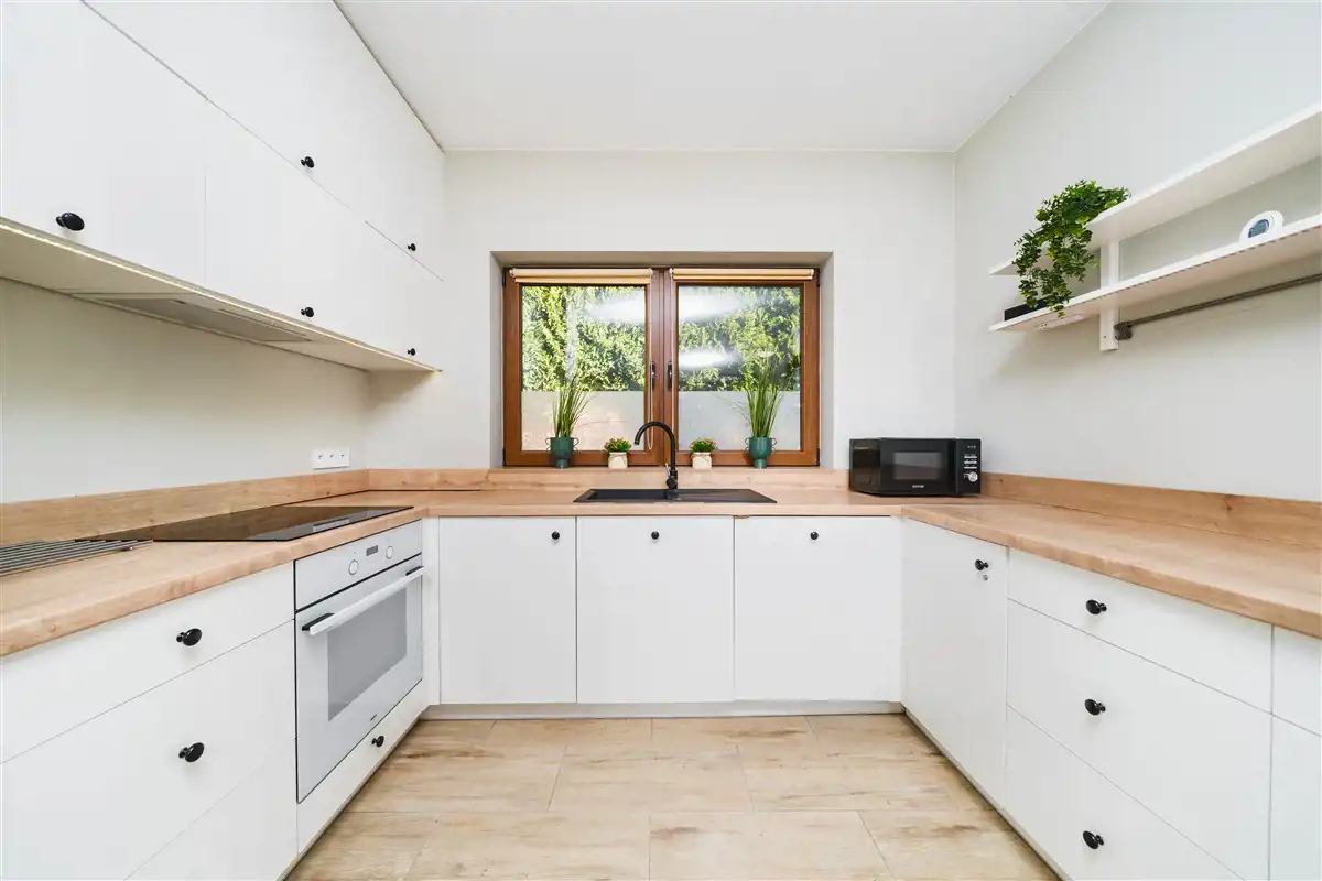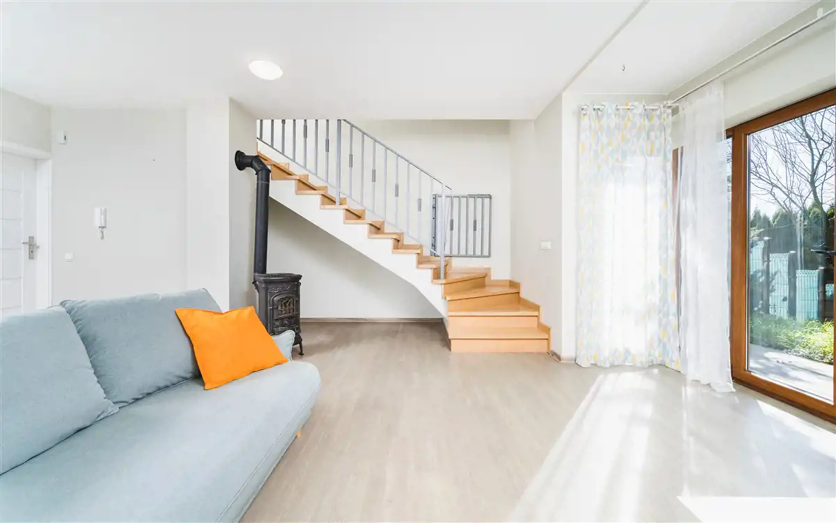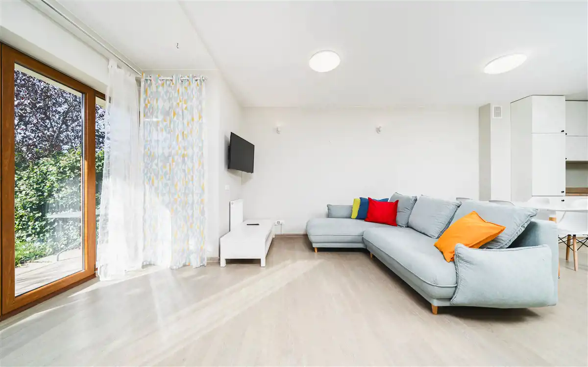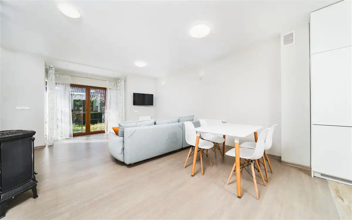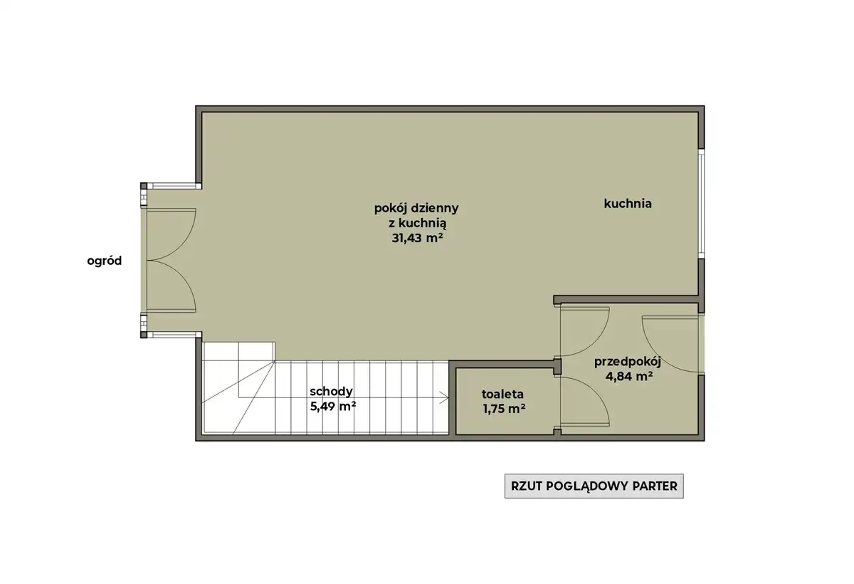 - przestronny salon z aneksem kuchennym (31,43 m2) i wyjściem do ogródka