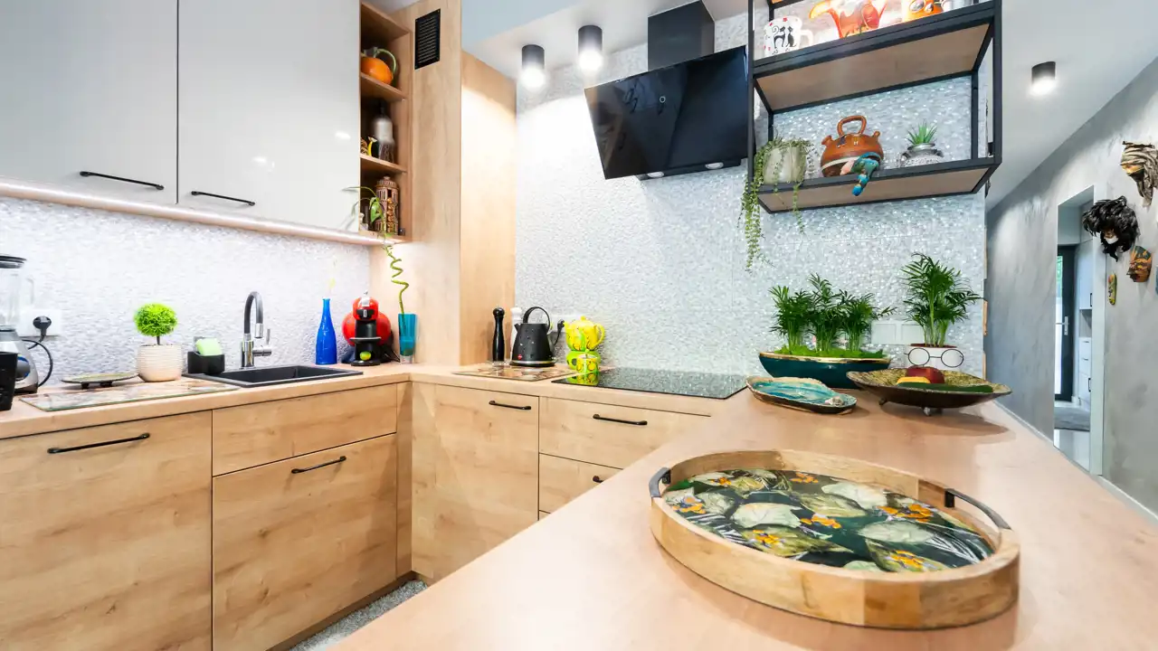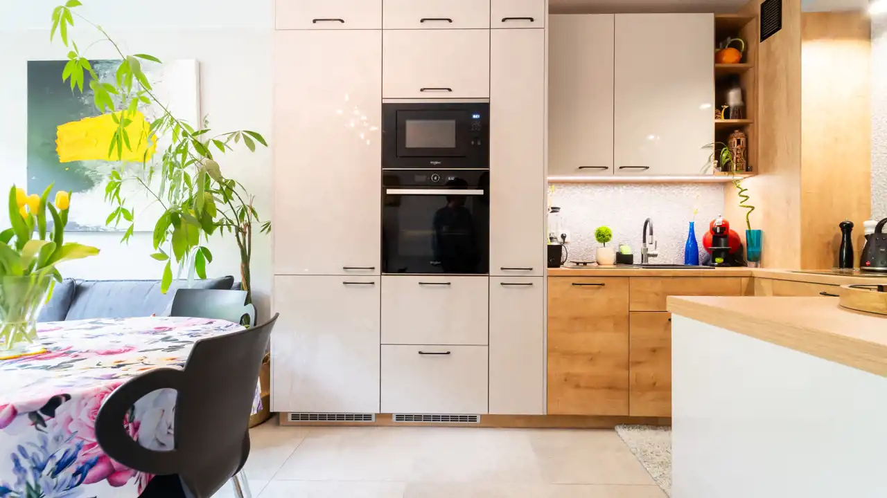 W kuchni także dbałość o każdy element, sprzęt wysokiej jakości marki Whirpool (płyta, piekarnik, mikrofalówka, zmywarka).