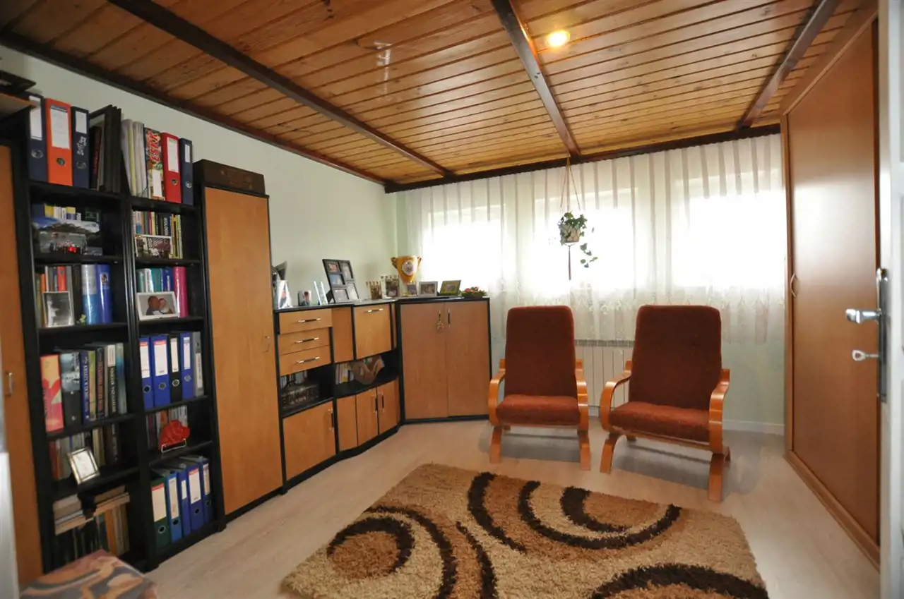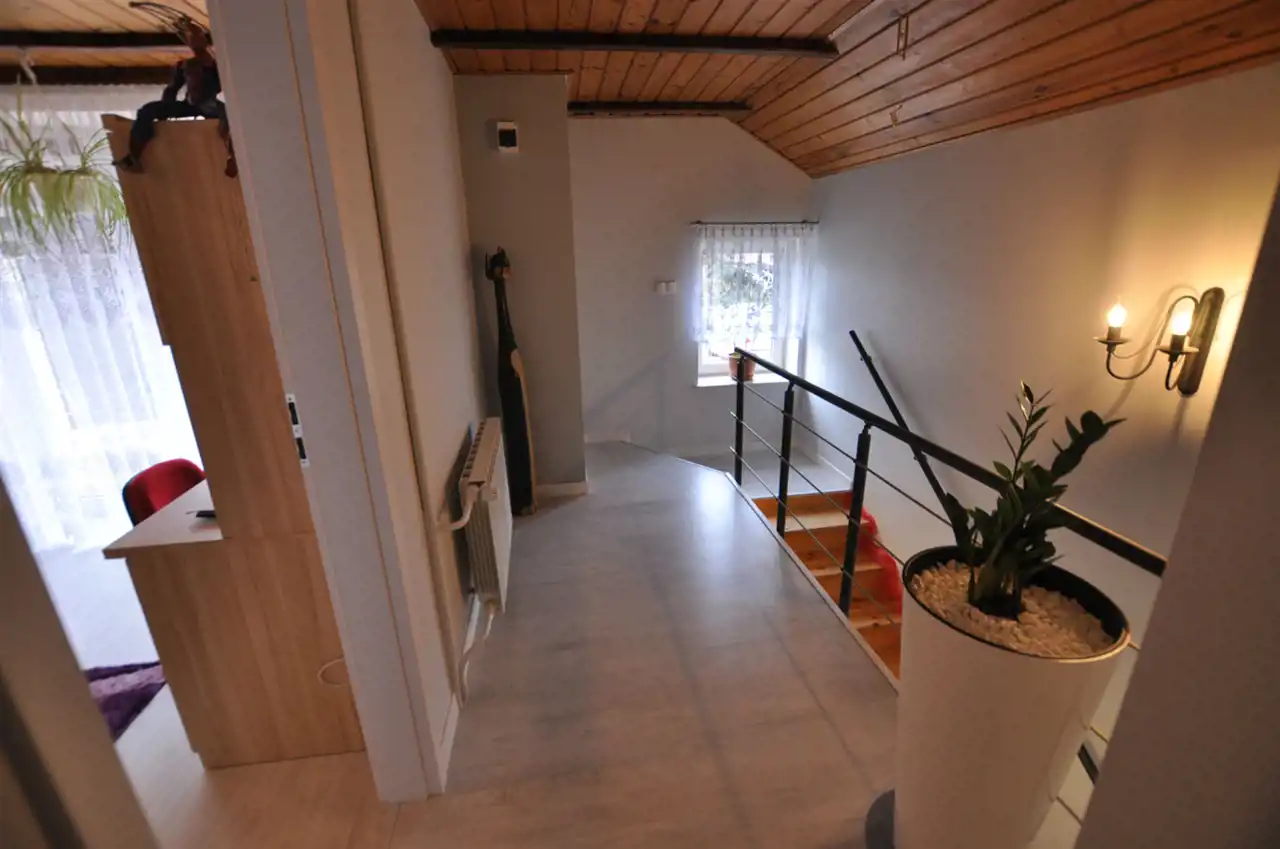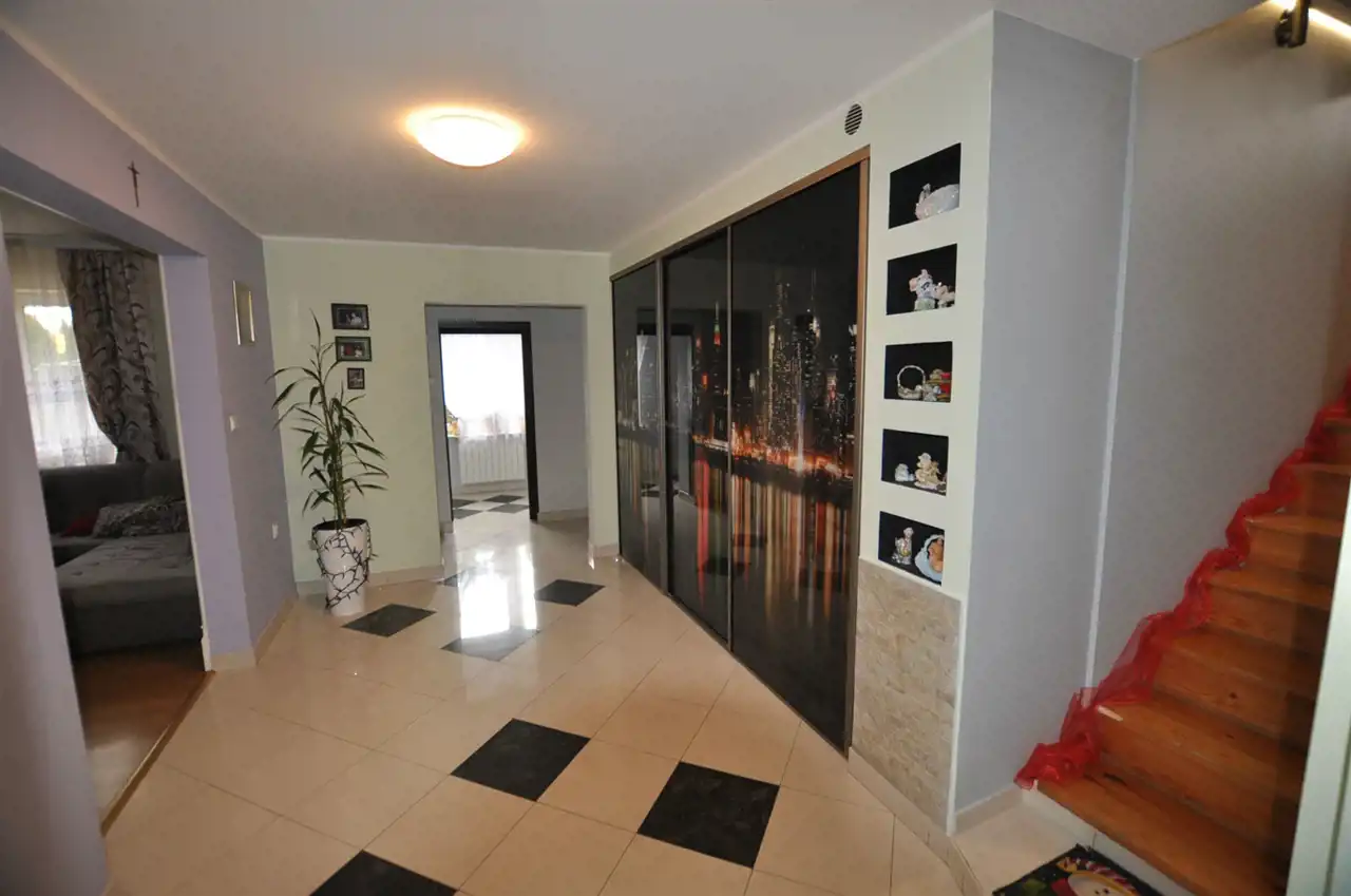 - duży salon z kominkiem; gabinet ; kuchnia widna ,w zabudowie , połączona z jadalnią - przy kuchni mała spiżarnia ; duży hol z szafą typu Komandor ; łazienka z wc ;przedpokój ,wiatrołap