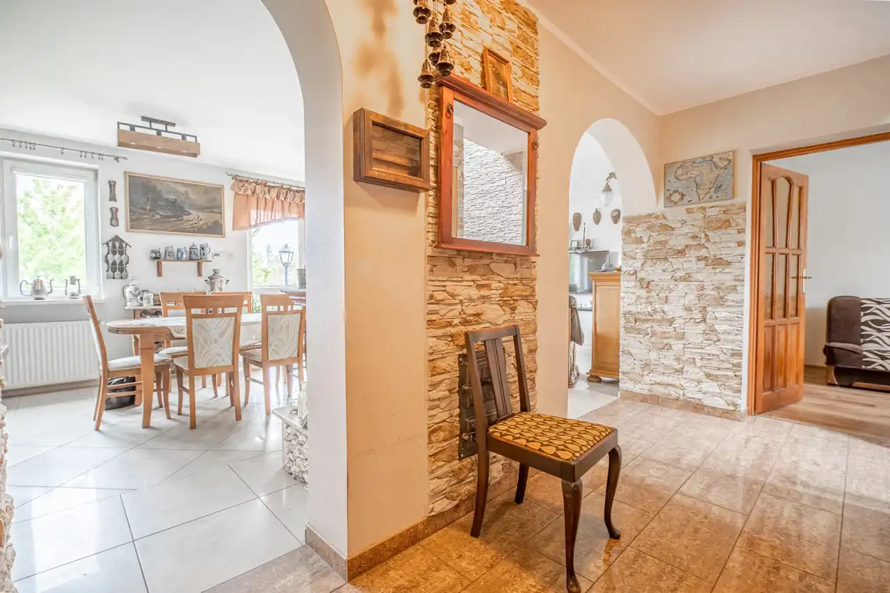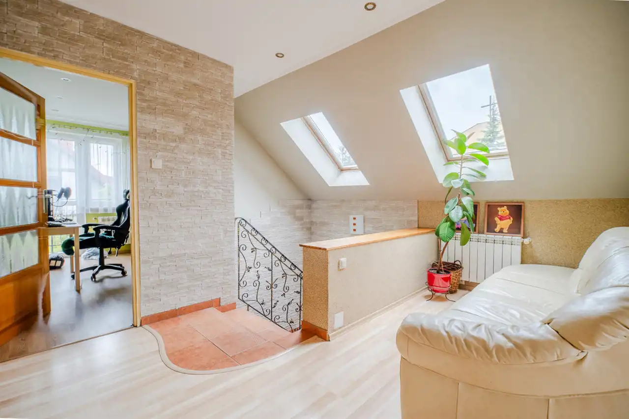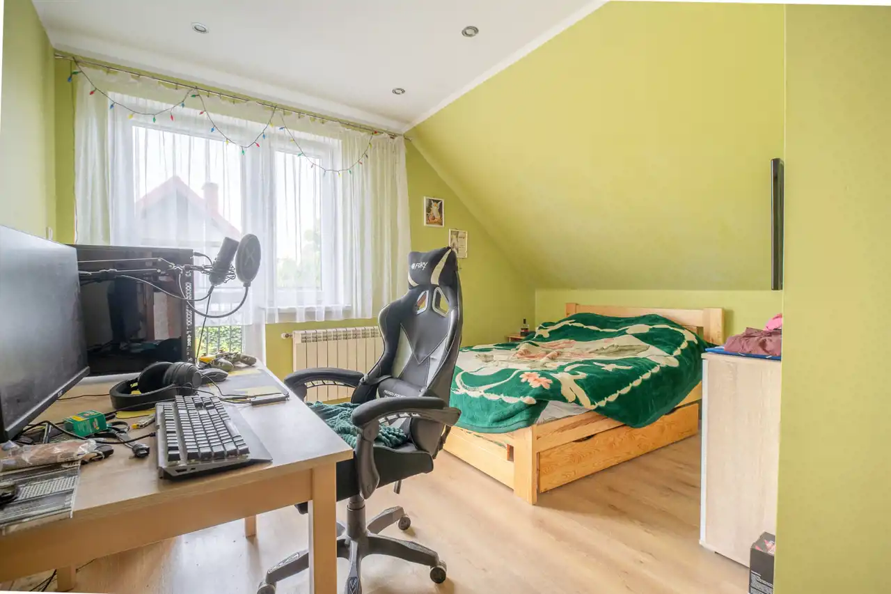 Dom oferuje układ 5-pokojowy, z dostępem do dużego salonu z wyjściem na balkon, na piętrze znajdują się 3 sypialnie, łazienka i garderoba.