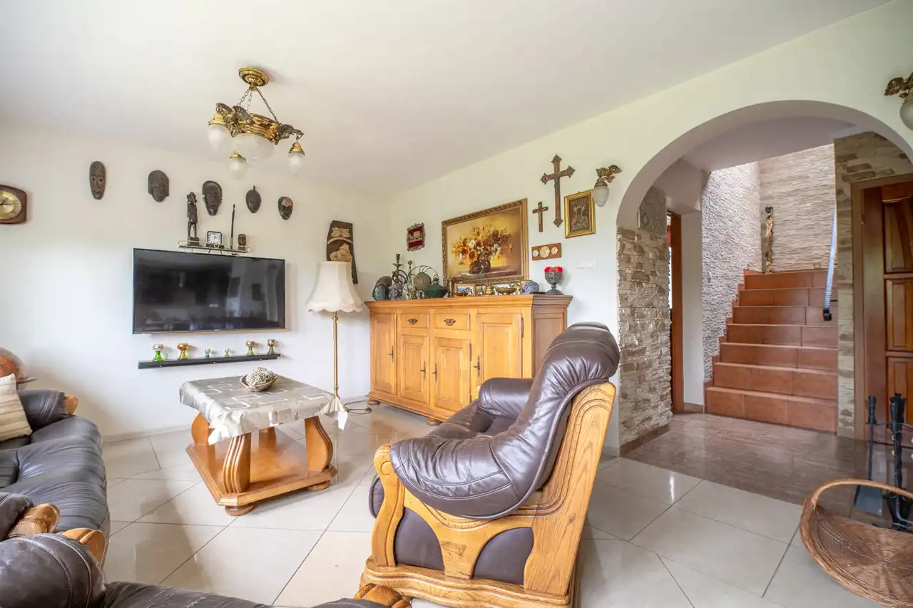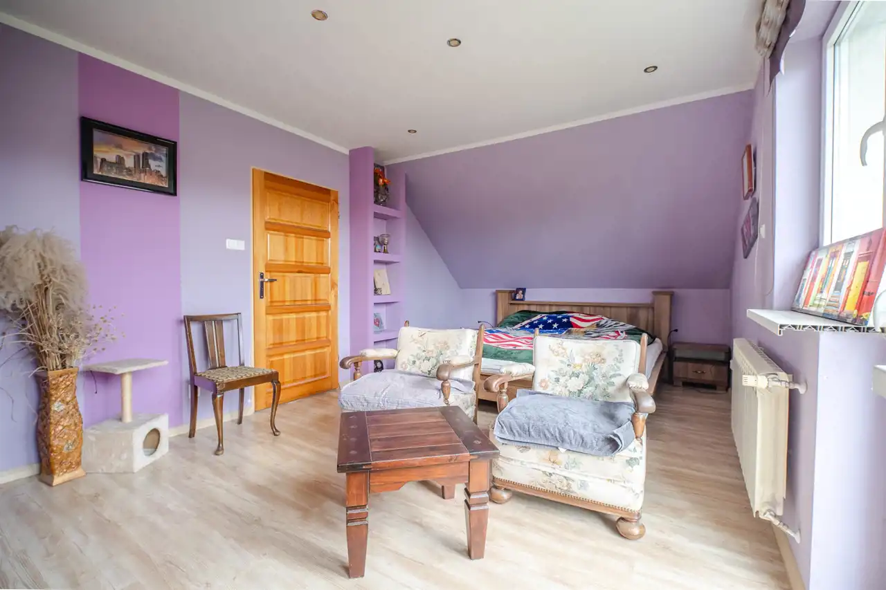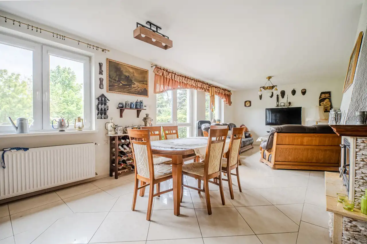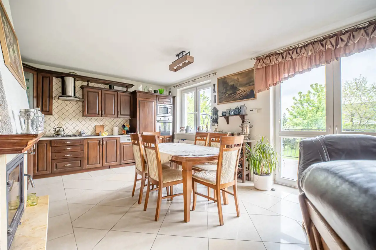 Dom oferuje układ 5-pokojowy, z dostępem do dużego salonu z wyjściem na balkon, na piętrze znajdują się 3 sypialnie, łazienka i garderoba.