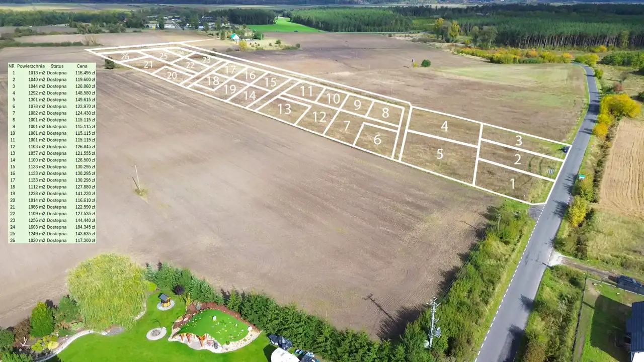 Lokalizacja i otoczenie: Kompleks działek położony jest w cichej i spokojnej okolicy, w sąsiedztwie lasu oraz terenów zielonych. To idealne miejsce dla osób ceniących bliskość natury, spacery i świeże powietrze. Wokół występuje jedynie zabudowa jednorodzinna i pola, co zapewnia kameralną atmosferę oraz znikomy ruch samochodowy.