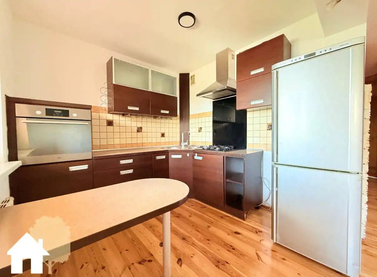 - salon z aneksem kuchenny i wyjściem na duży balkon (kuchnia wyposażona w szafki, lodówkę, piekarnik, płytę gazową, zlew, okap)