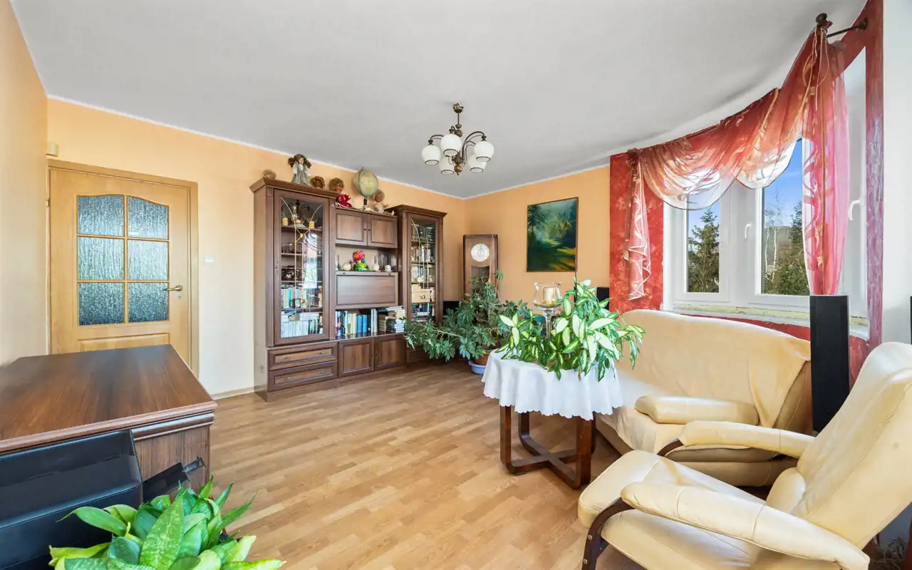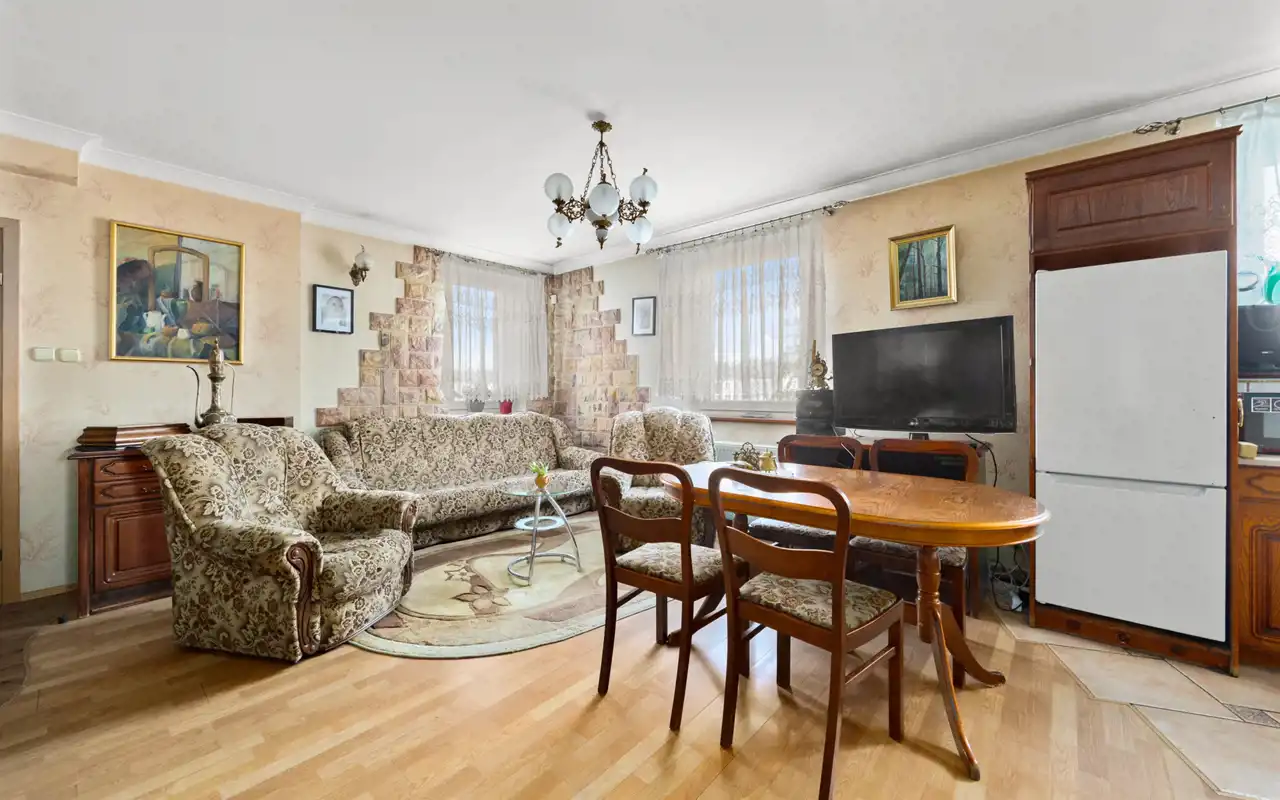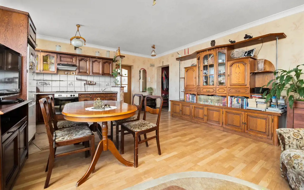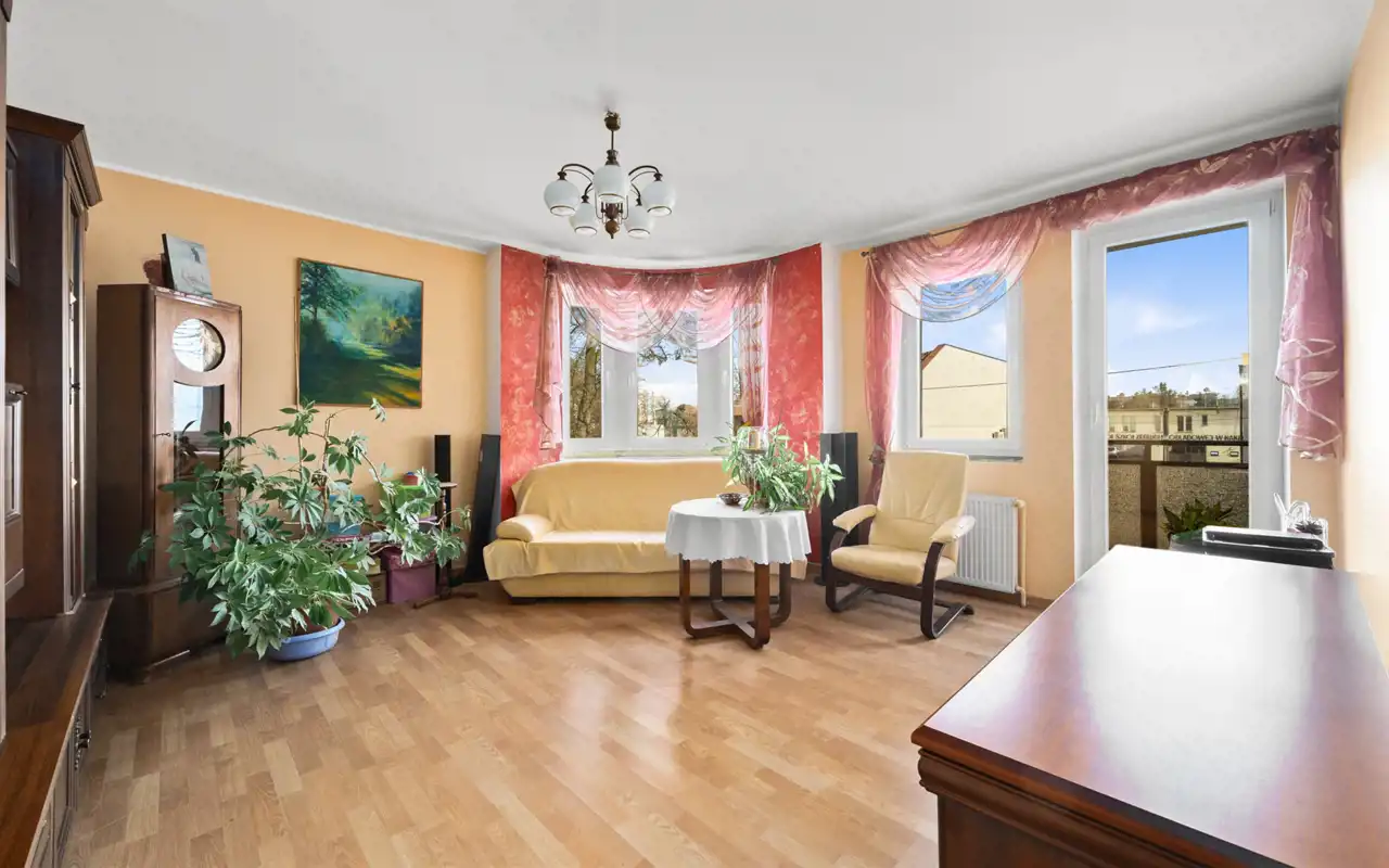 Mieszkanie oryginalnie stanowiło trzy pokoje z osobną kuchnia, lecz ściana działowa między pokojem a kuchnią została usunięta i powstał salon z aneksem. Lokal bez problemu można przywrócić do układu pierwotnego.