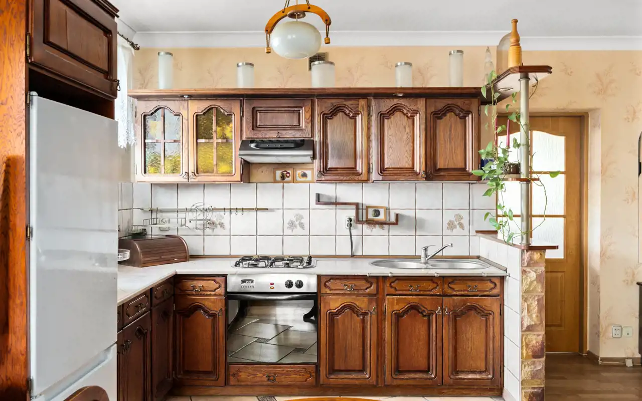 Na podłodze panele i kafle, na ścianach piaskowiec i tapeta.