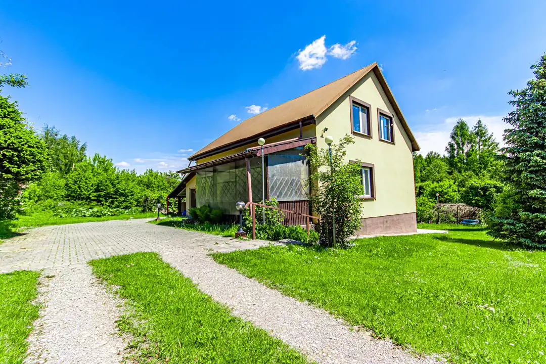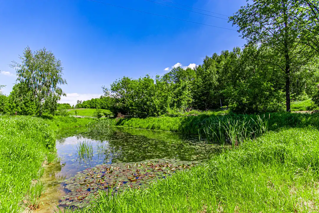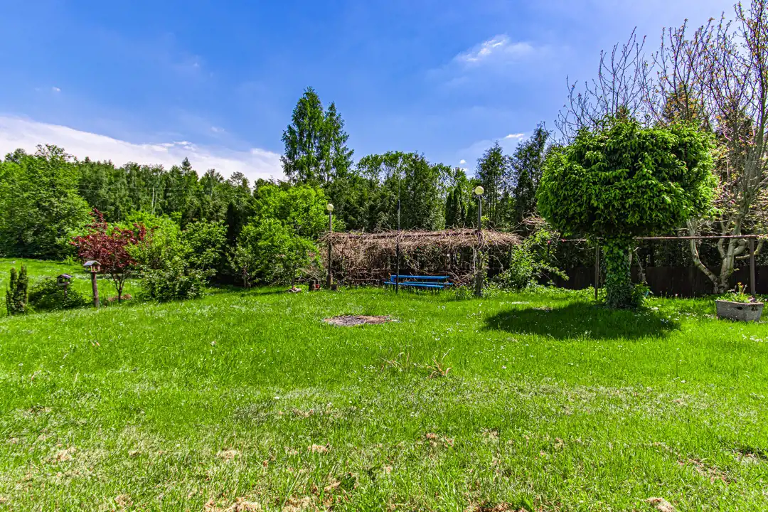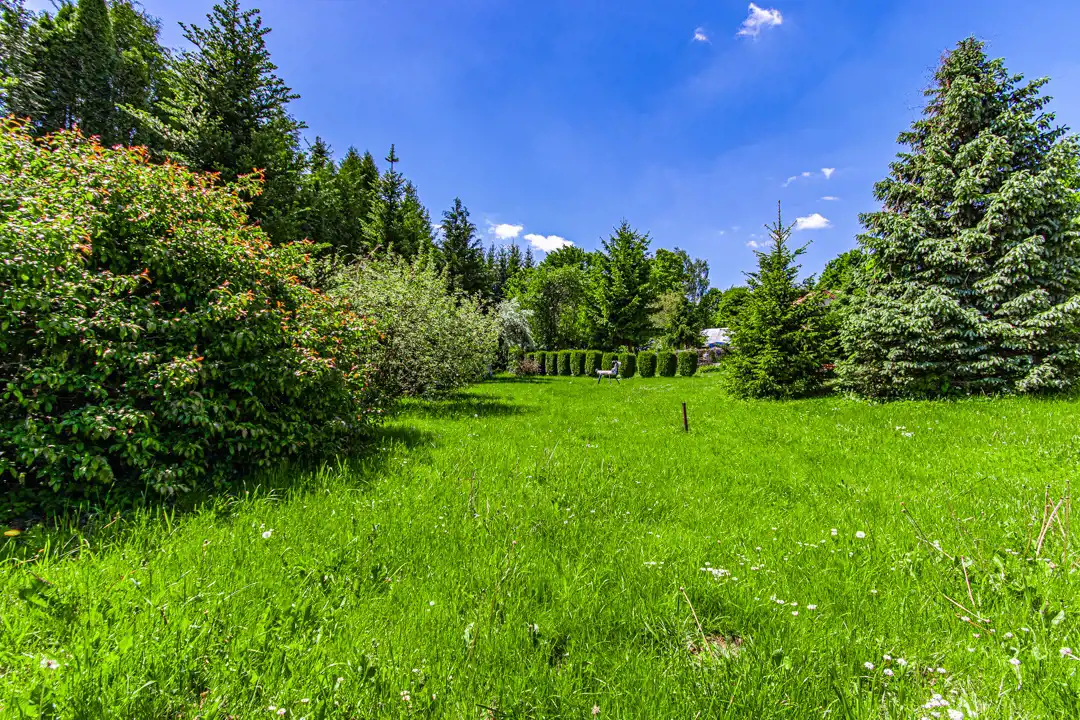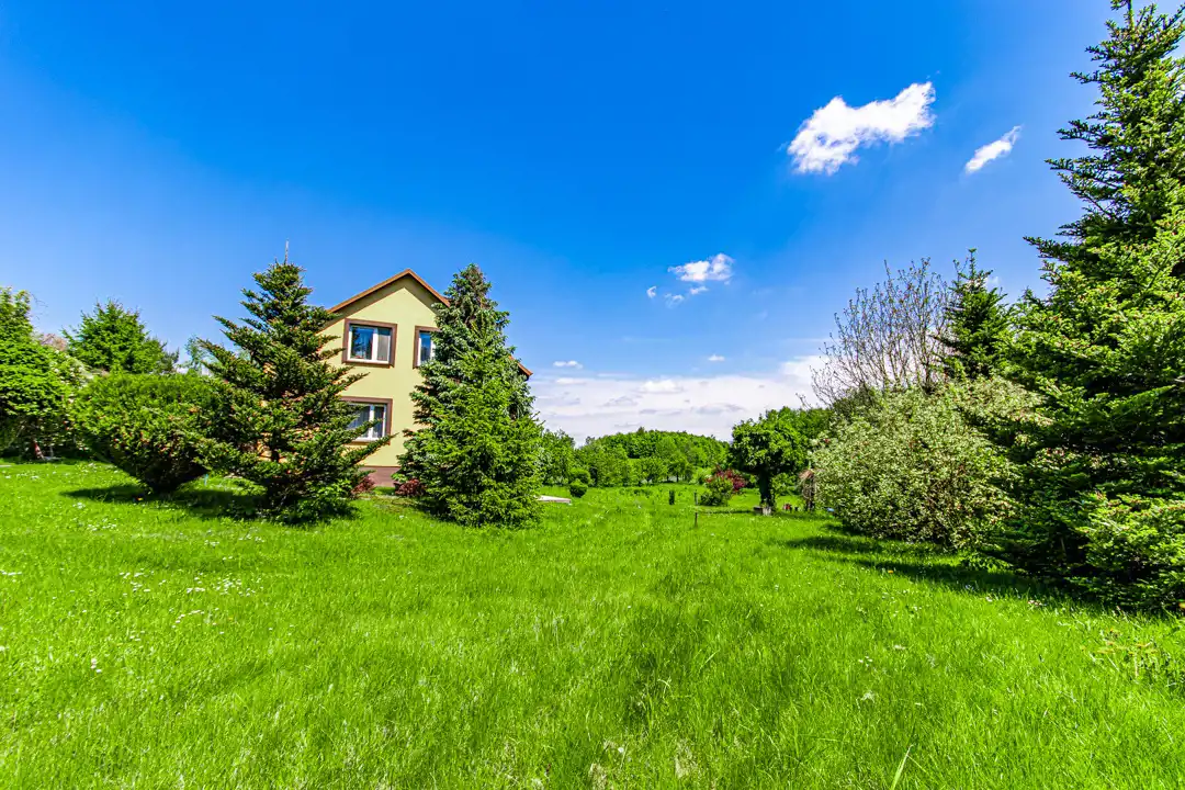 Nieruchomość położona na pięknej, dużej działce. Na jej terenie znajduje się staw, liczne nasadzenia oraz miejsce do wypoczynku.