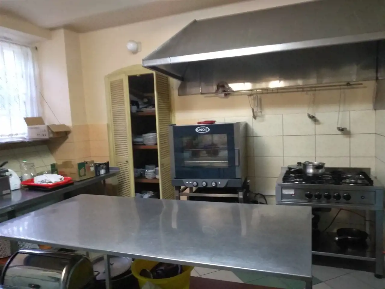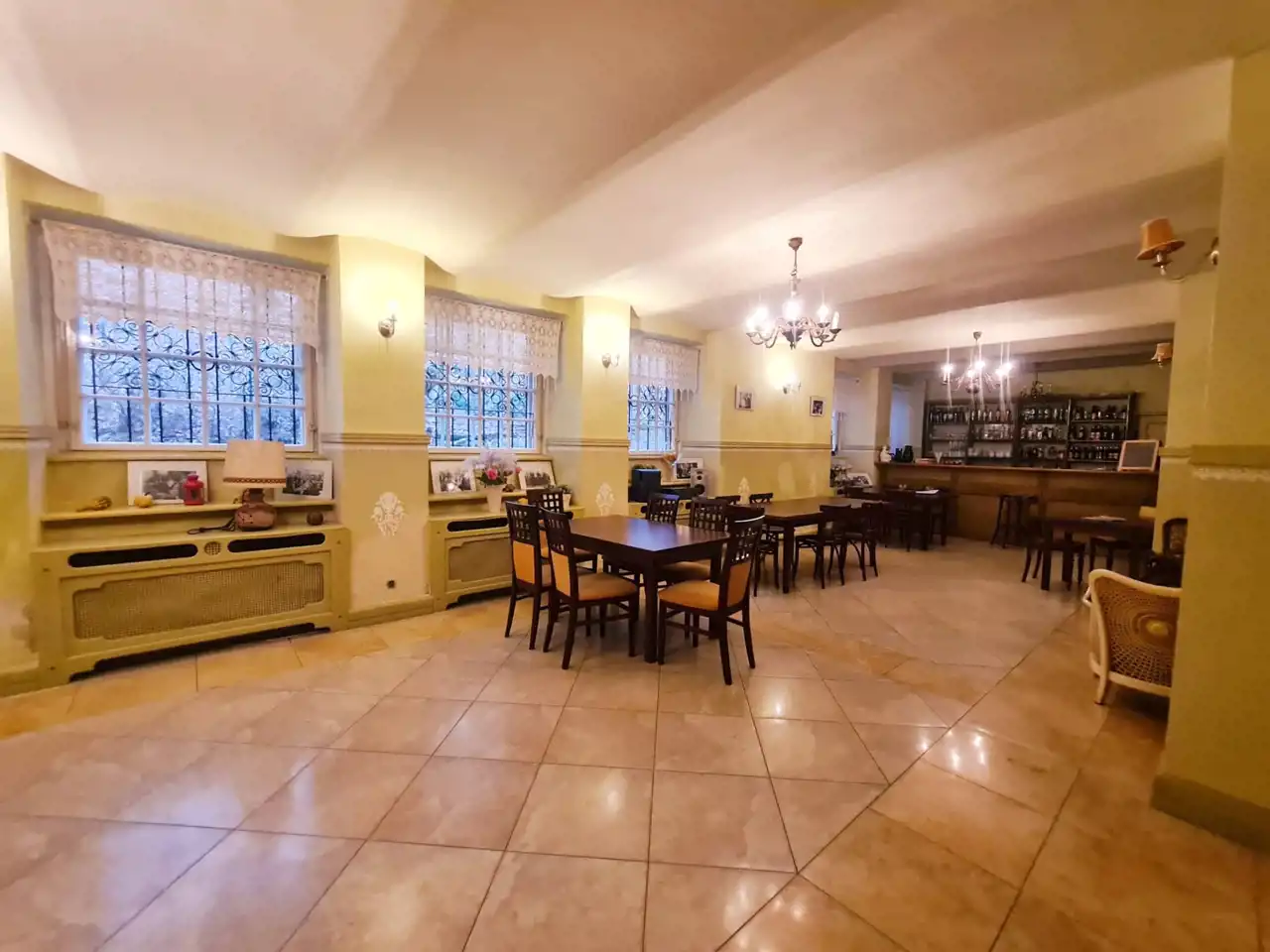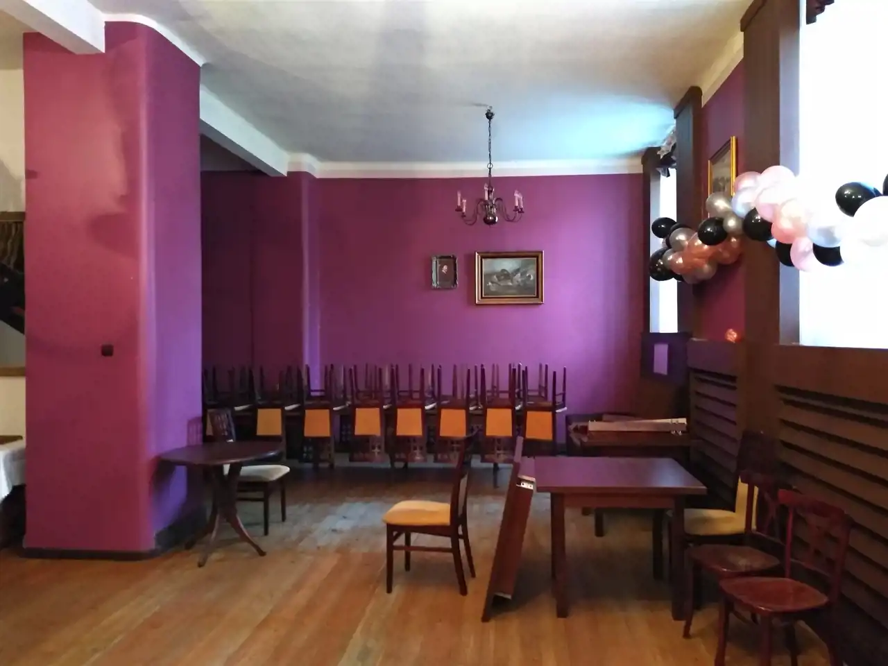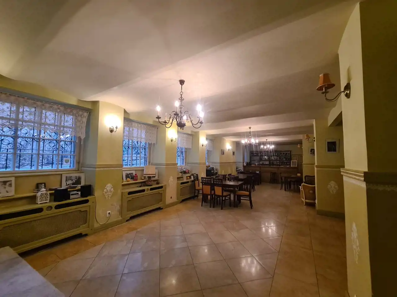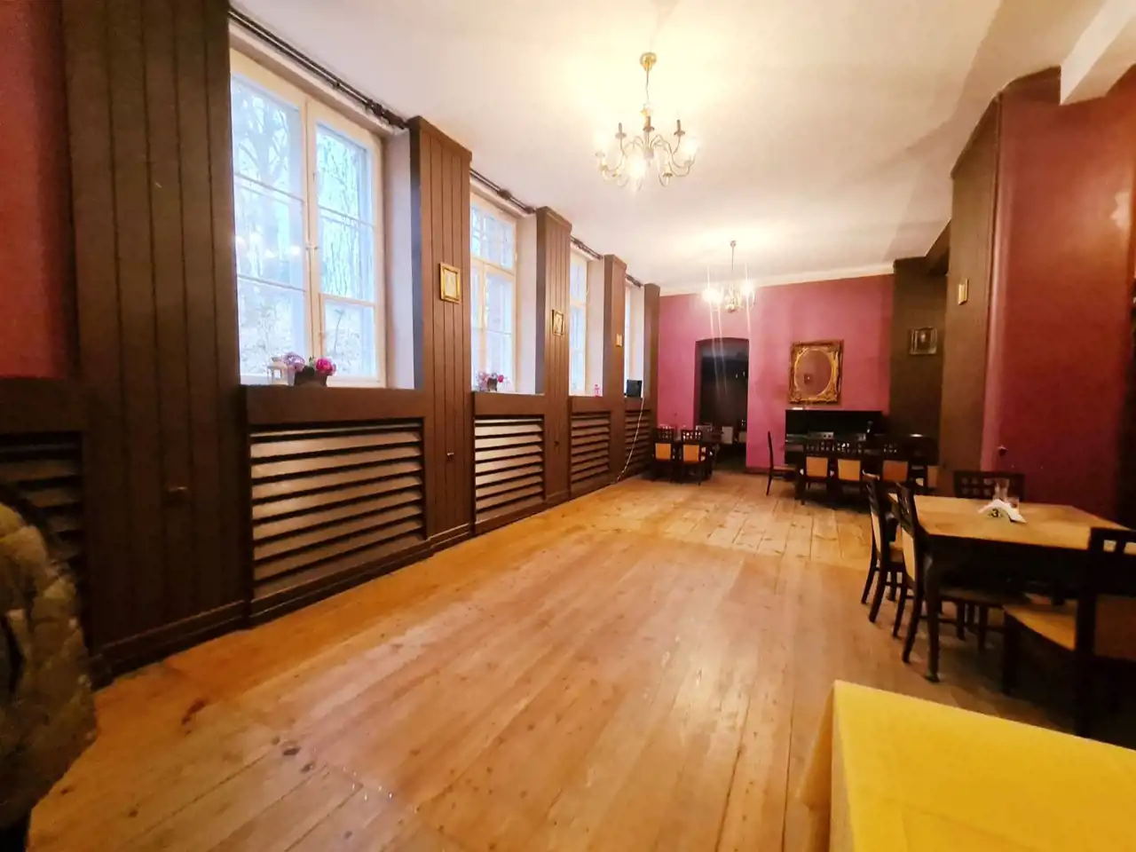 W przyziemiu sala restauracyjna z barem i zapleczem kuchennym oraz dwie toalety.
