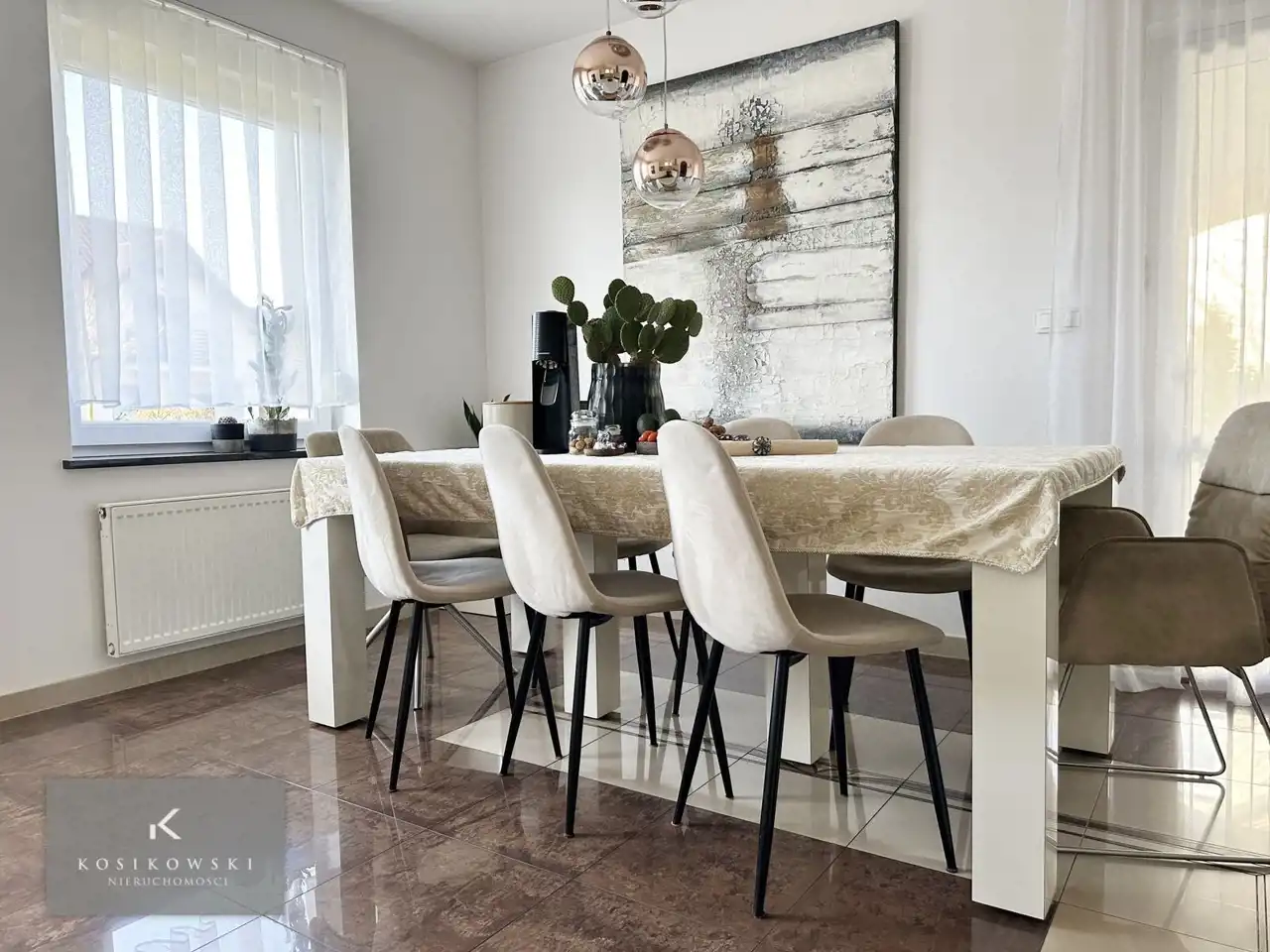 Salon i kuchnia tworzą komfortową, jasną przestrzeń dzienną – idealną do życia rodzinnego i spotkań towarzyskich. Gustowne wykończenie, jasne kolory oraz starannie dobrane dodatki podkreślają elegancki charakter wnętrza.